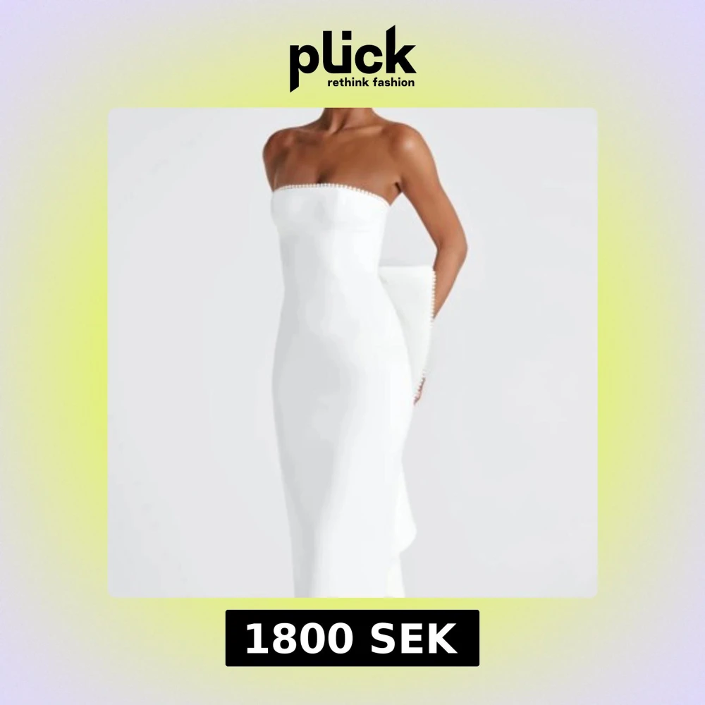 Säljer en vit klänning från babyboo som är slät och figursydd. Den har en rosett med pärlor som är avtagbar och den är dekorerad med pärlor över bröstet. Storlek XS/34.