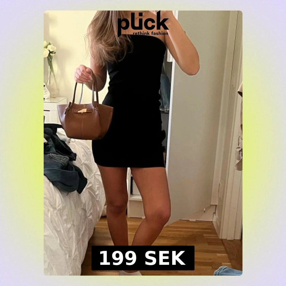 Säljer en svart, axelbandslös kortklänning med tight passform. Klänningen har en enkel och stilren design utan synliga detaljer eller mönster, perfekt för dig som gillar minimalistisk stil. Materialet känns mjukt och stretchigt mot kroppen.