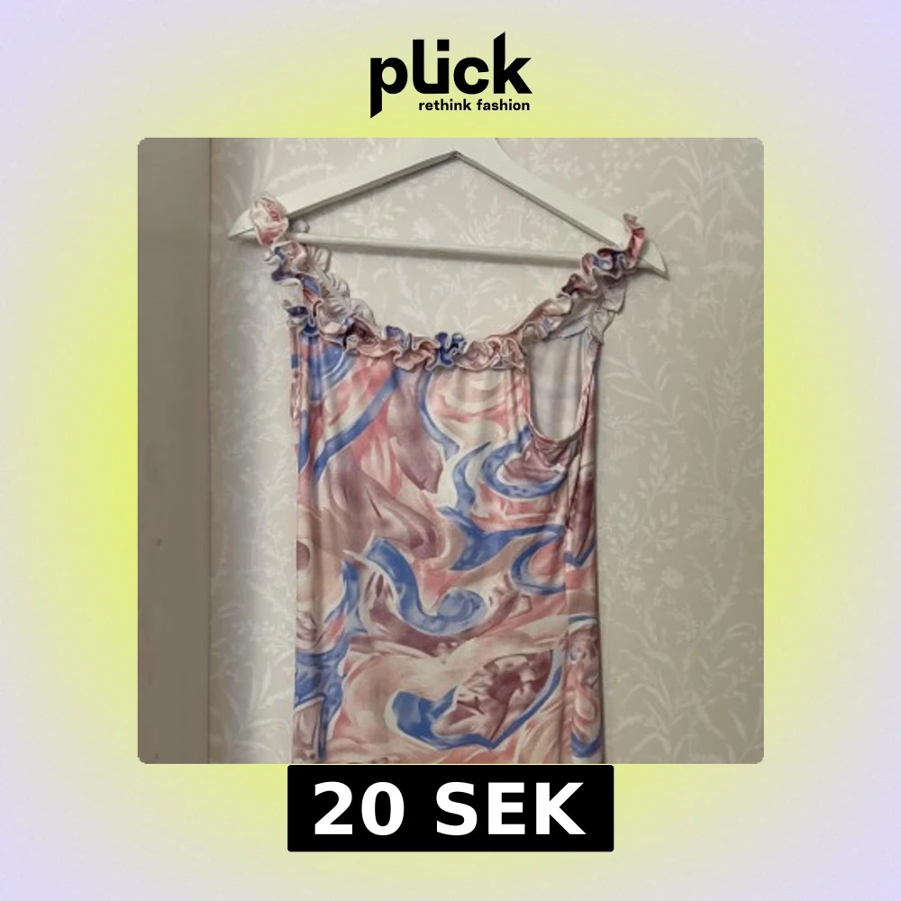 Säljer en färgglad klänning med abstrakt mönster i rosa, blått och beige. Klänningen har volangdetaljer vid axlarna och en slits framtill. Perfekt för en somrig look!