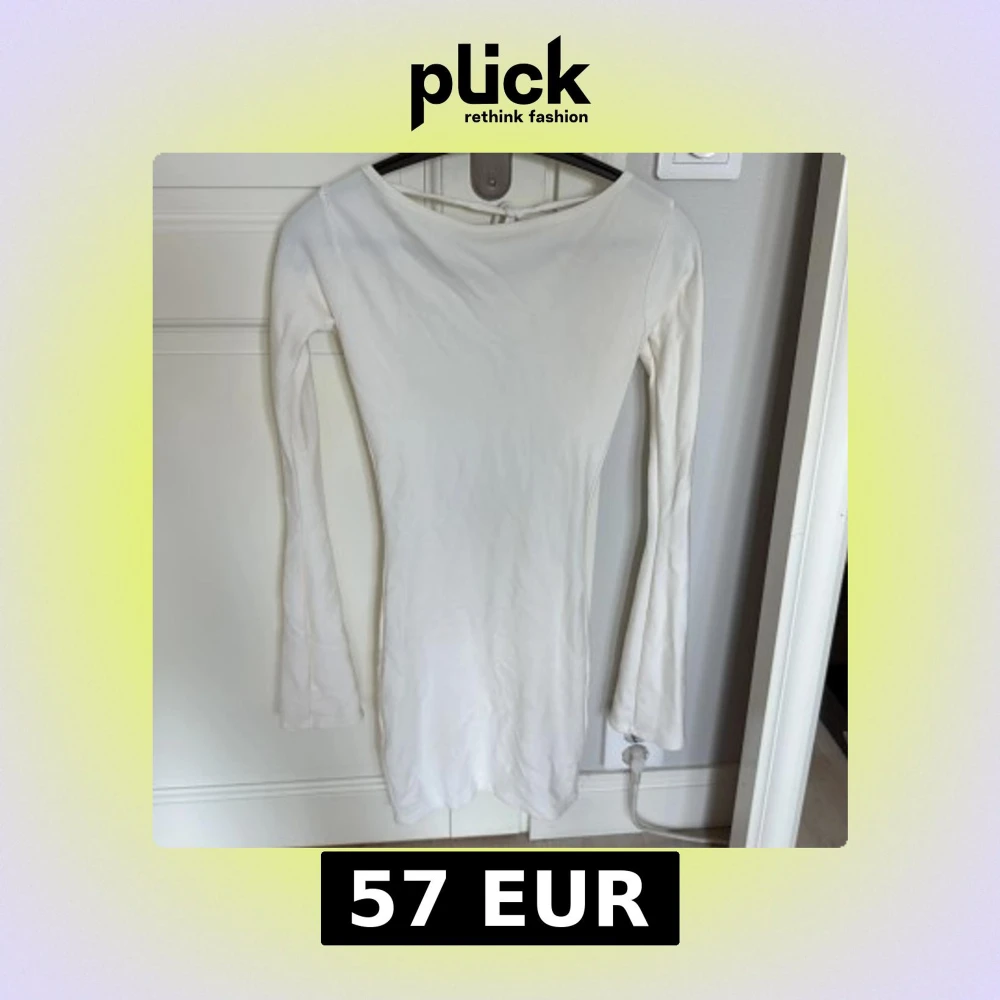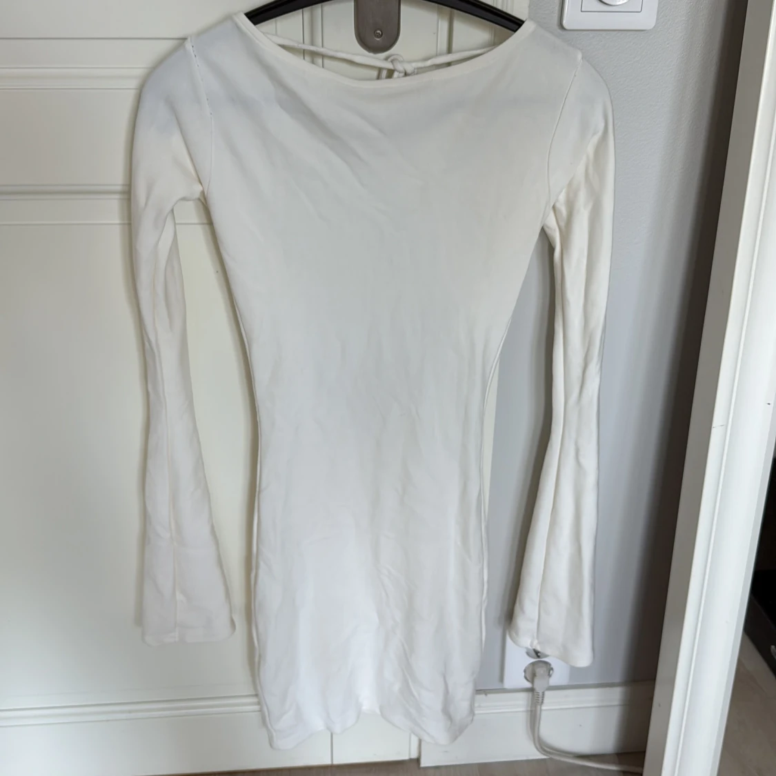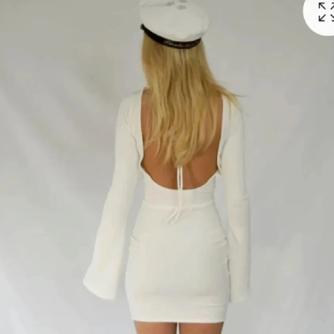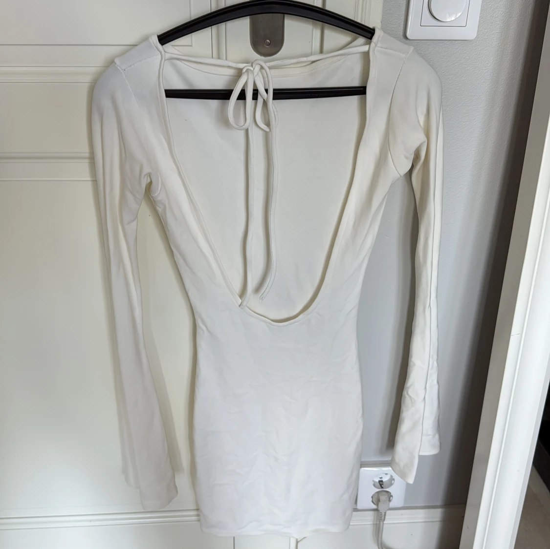 Supersnygg vit kort klänning med långa ärmar och öppen rygg som knyts med band i nacken. Klänningen har en tight passform och är tillverkad i ett mjukt material som sitter skönt på kroppen.