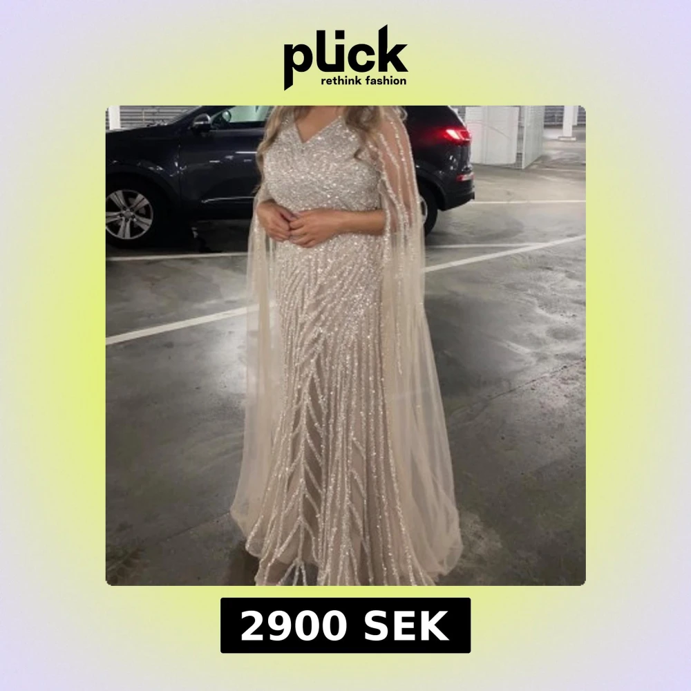 Säljer en magisk champagnefärgad långklänning med glittriga paljetter och v-ringad hals. Klänningen har ett elegant cape-liknande fall över axlarna och ett mönster av glittrande linjer. Använd några timmar. Storlek xs/s