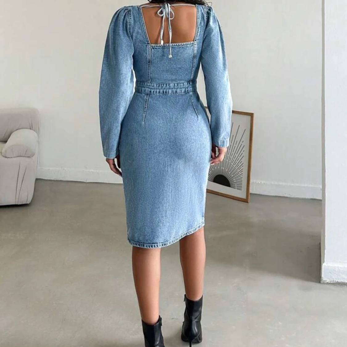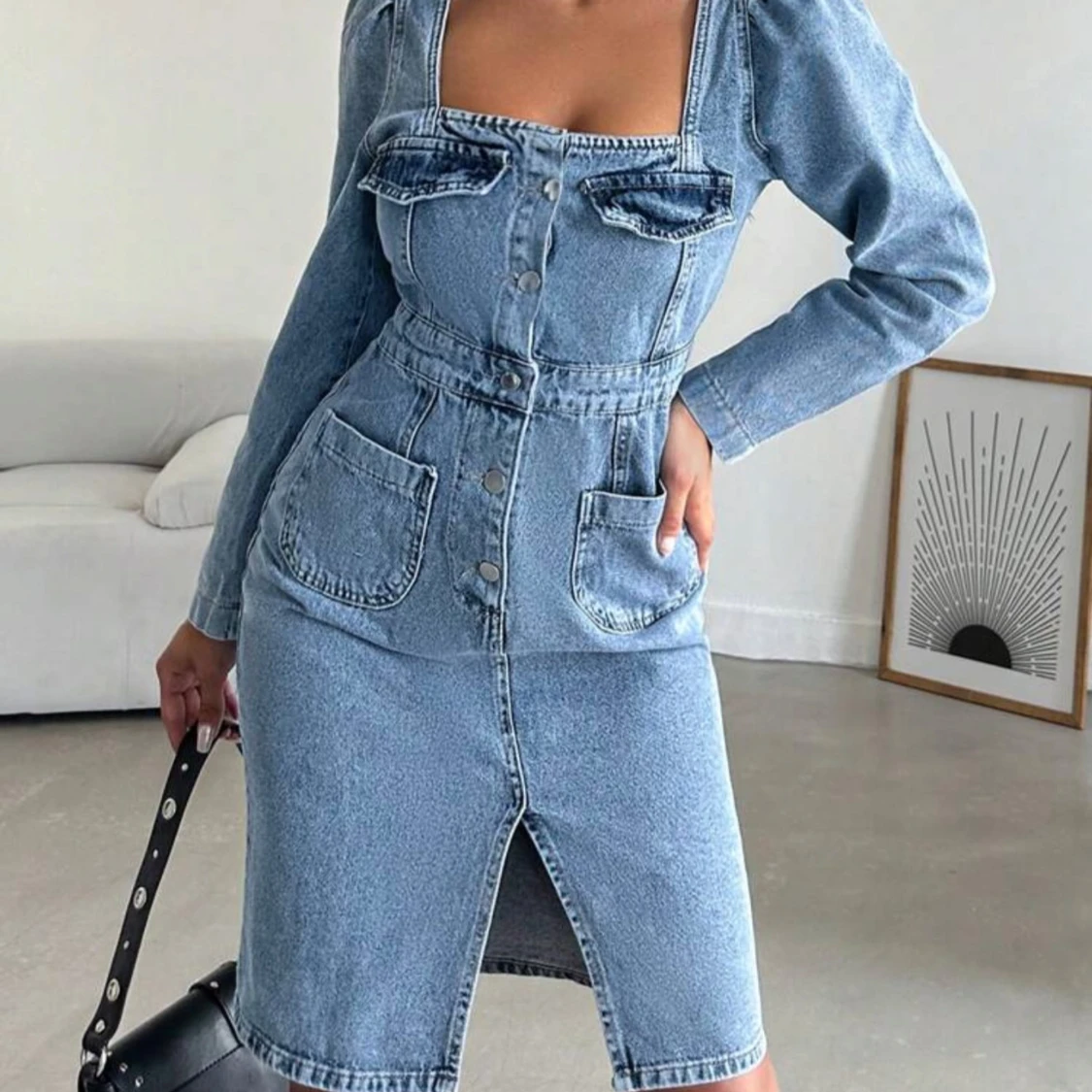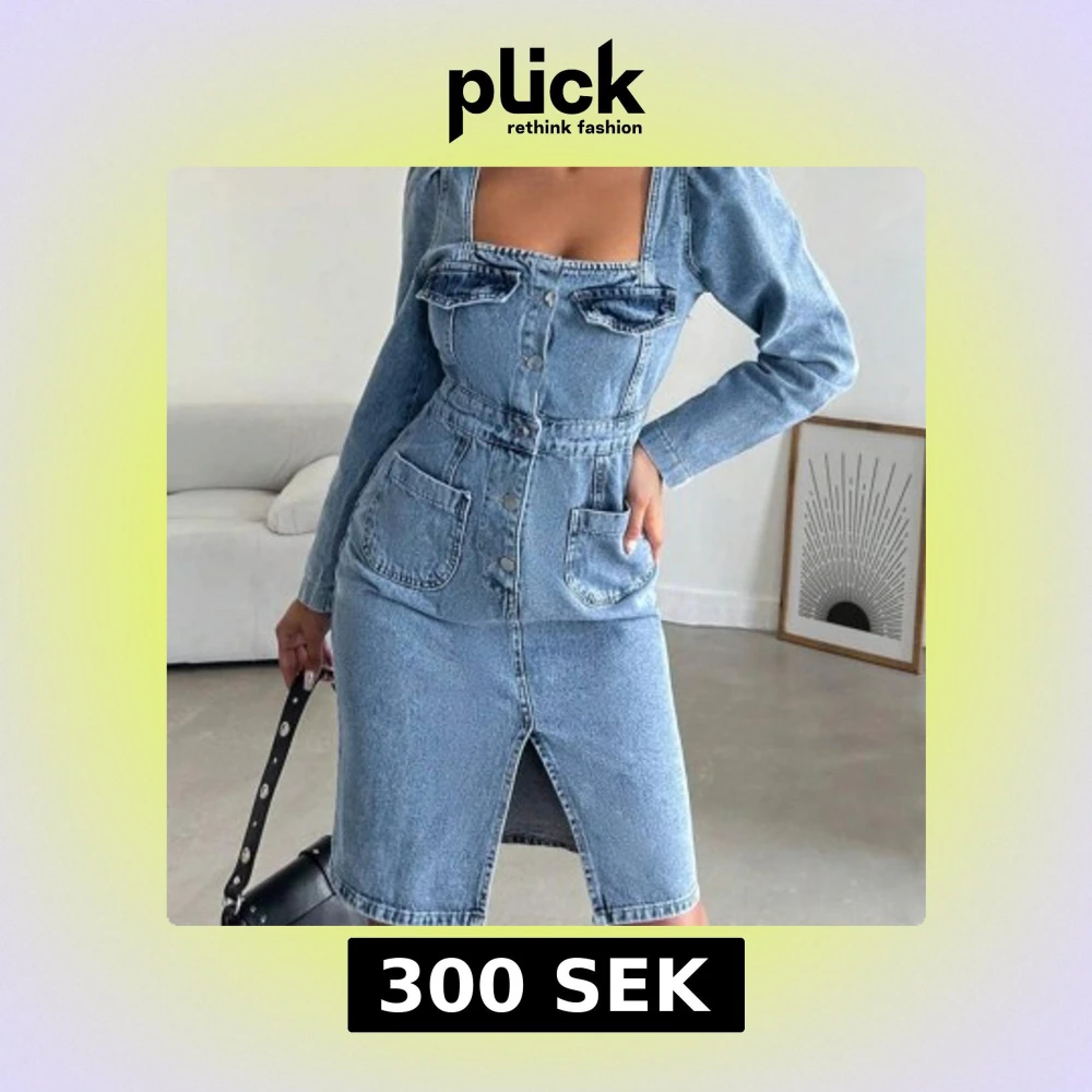 Snygg ljusblå jeansklänning med lång ärm, markerad midja och stora fickor framtill. Klänningen har knappar hela vägen, slits framtill och fyrkantig ringning med knyt i ryggen. Perfekt för dig som gillar en cool och trendig denimlook. Aldrig använd.