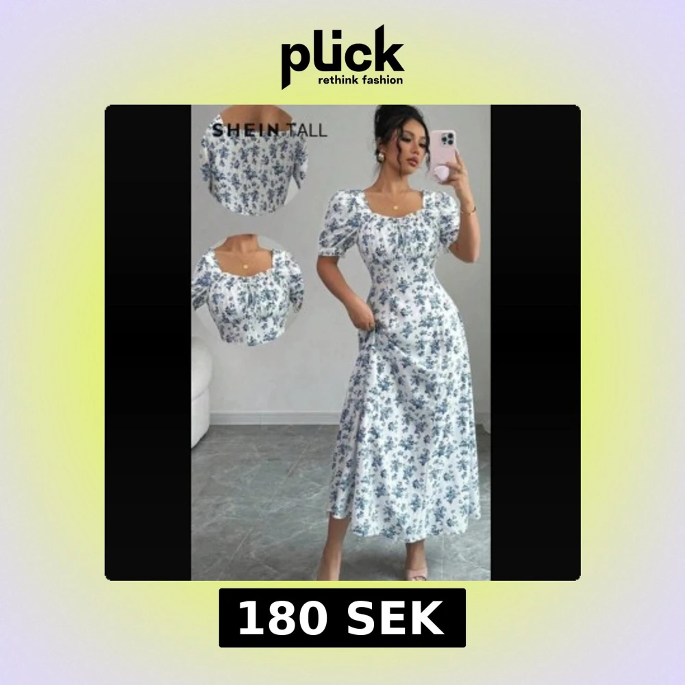 Superfin långklänning från SHEIN med blått blommönster på vit botten. Klänningen har puffiga kortärmar, smockad överdel och söt fyrkantig ringning. Perfekt för sommarens alla tillfällen och ger en romantisk vibe.