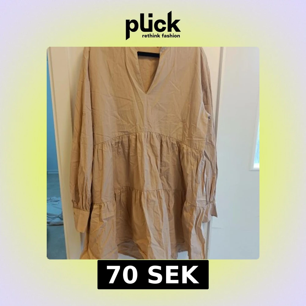 Säljer en beige klänning med v-ringad hals och volangdetaljer. Klänningen har lång ärm och är tillverkad i ett lätt bomullsmaterial. Den har en loose passform och är perfekt för dig som gillar en avslappnad stil.