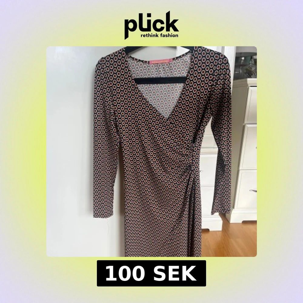 Säljer en snygg omlottklänning från Pernilla Wahlgren med svart botten och cirkelmönster. Klänningen har v-ringning, långa ärmar och knyt/rynk i midjan.