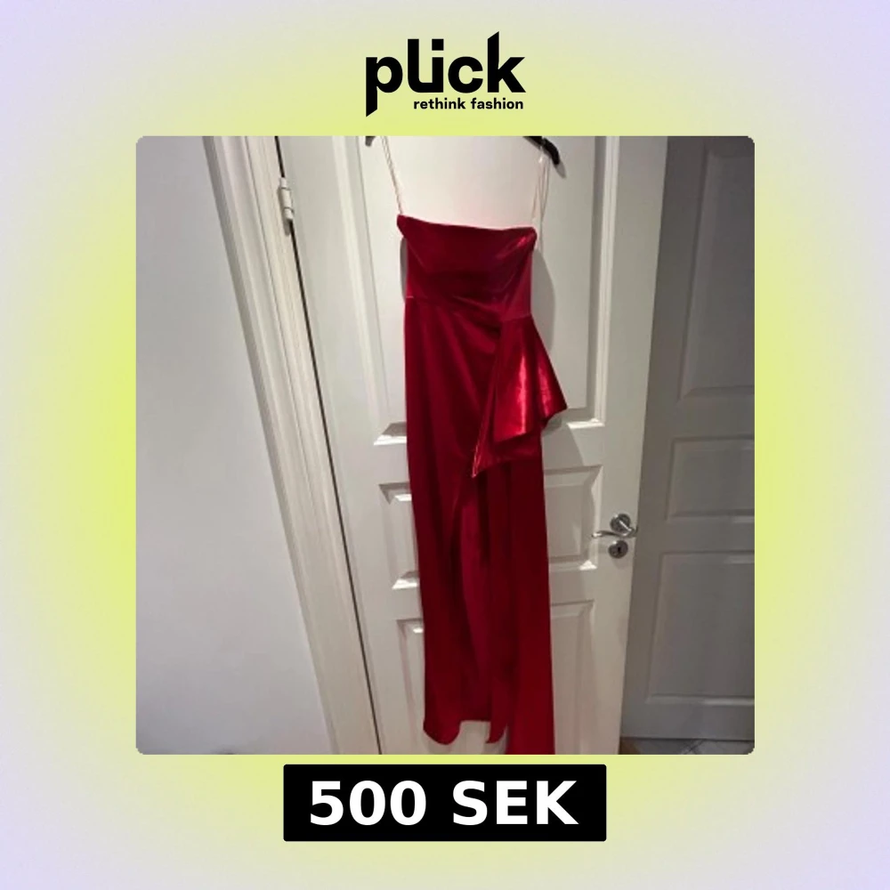 Snygg röd axelbandslös långklänning i satin från Fashion Nova. Klänningen har en elegant drapering på sidan och en figurnära passform som ger en glamorös look. Perfekt för speciella tillfällen.