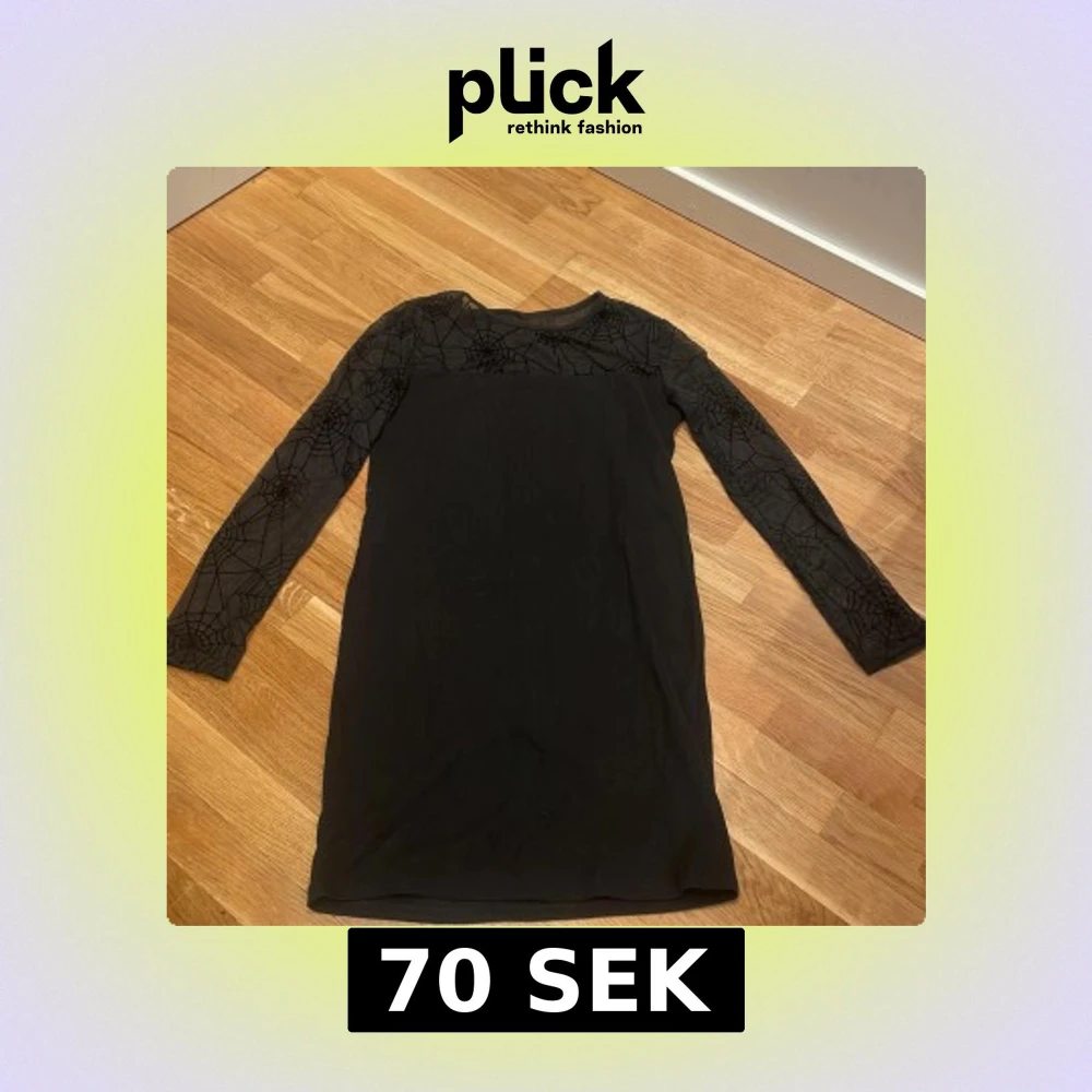 Säljer en svart kortklänning med långa ärmar i mesh och coolt spindelnätsmönster på axlar och ärmar. Klänningen har en enkel, rak passform och är perfekt för halloween eller temafest.
