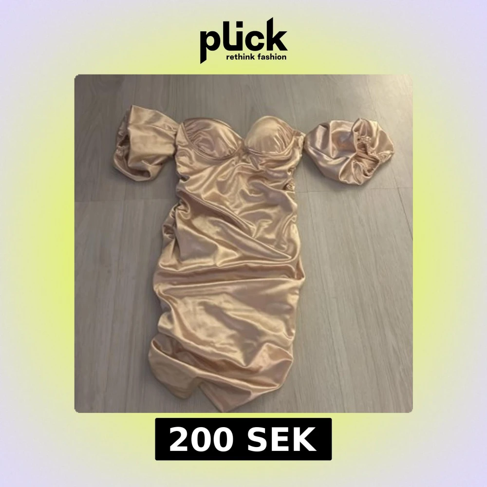Elegant champagnefärgad klänning i satin med puffiga kortärmar och rynkade detaljer. Den har en smickrande passform med en vacker glans som fångar ljuset perfekt. Perfekt för speciella tillfällen. Använt bara en gång