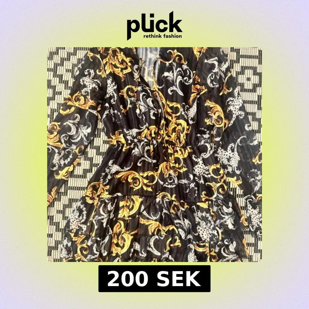 Snygg kortklänning med svart bas och detaljerat mönster i guld och vitt. Klänningen har långa ärmar, omlottliv och volang i kjolen. Materialet är lätt och genomskinligt, perfekt för dig som gillar statement-plagg med lyxig känsla. Går över knäna . Aldrig använd