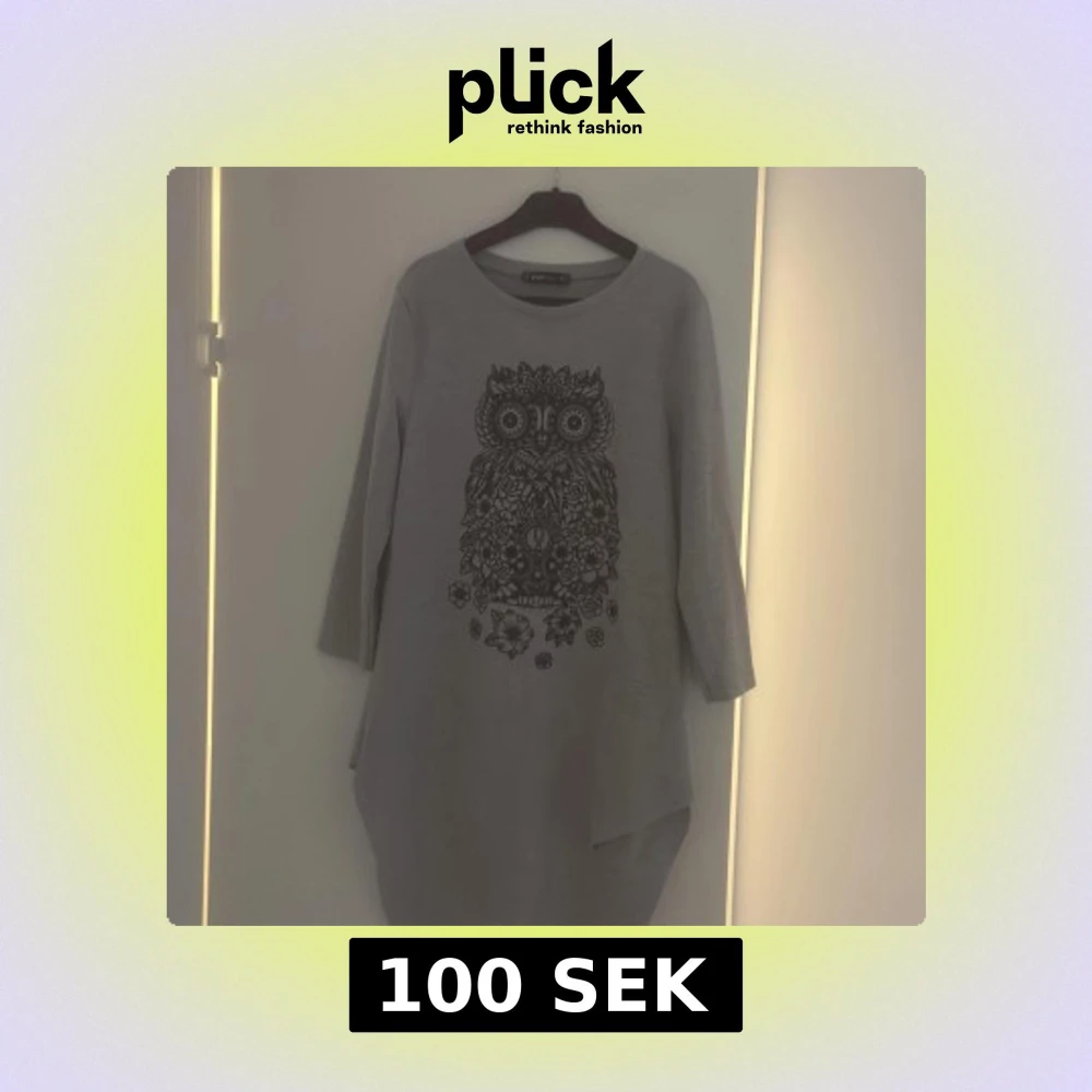 Säljer en grå långklänning från FB Sister i storlek XS. Klänningen har ett stort svart uggletryck med blommor framtill, rund hals och trekvartsärm. Materialet är mjukt och känns som bomull. Asymmetrisk nederkant ger en cool vibe.