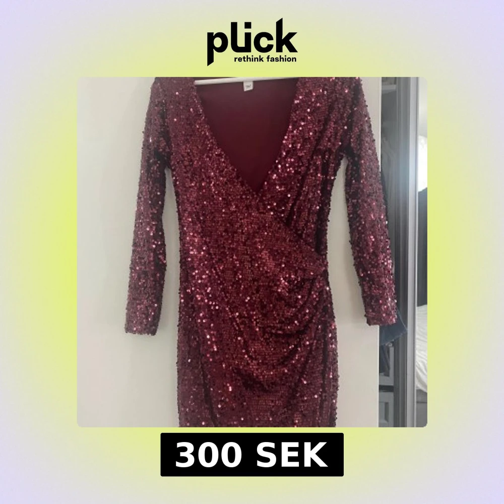 Snygg vinröd klänning med paljetter och omlott-design. Klänningen har en v-ringad fram och långa ärmar, perfekt för en festlig kväll.