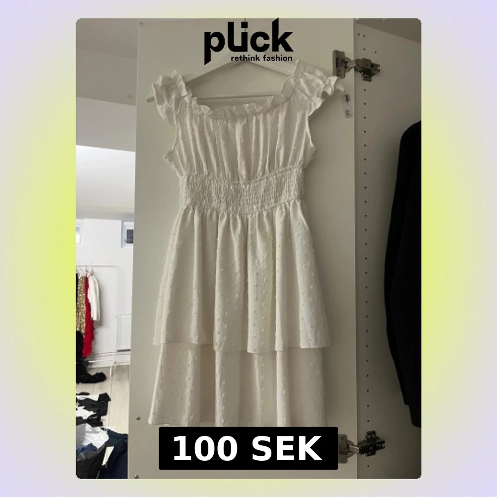 Superfin vit kort klänning med volanger och små prickar i tyget. Klänningen har offshoulder-ärmar med rynkade detaljer och smock i midjan för en snygg passform. Perfekt för sommarens alla tillfällen, lätt och luftig med romantisk vibe.