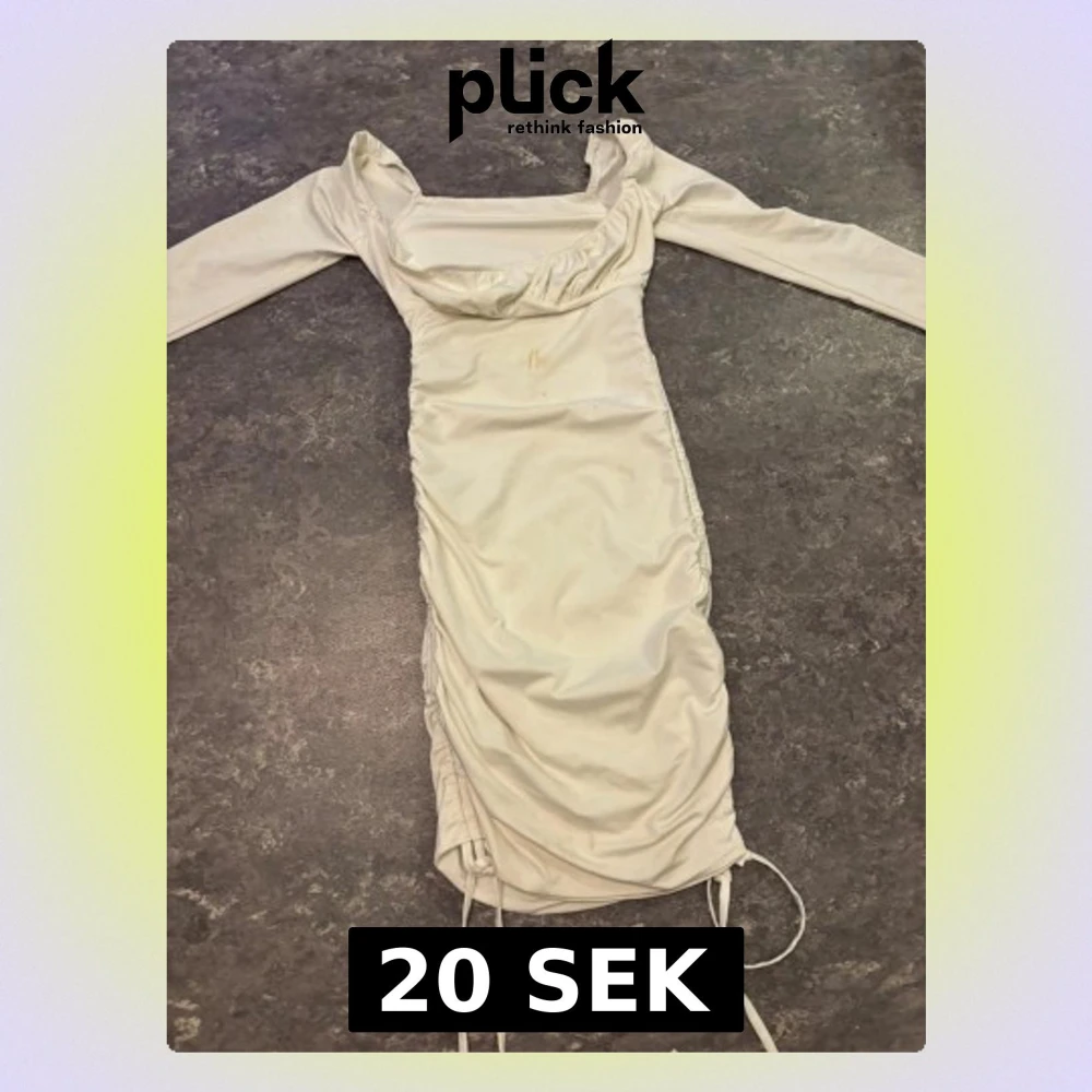 Snygg vit klänning med långa ärmar och omlottdetaljer. Klänningen har rynkade sidor med snörning nertill och en fyrkantig urringning. Perfekt för dig som gillar en stilren look med lite extra detaljer. Har en liten smink fläck som nog går att tvätta bort .