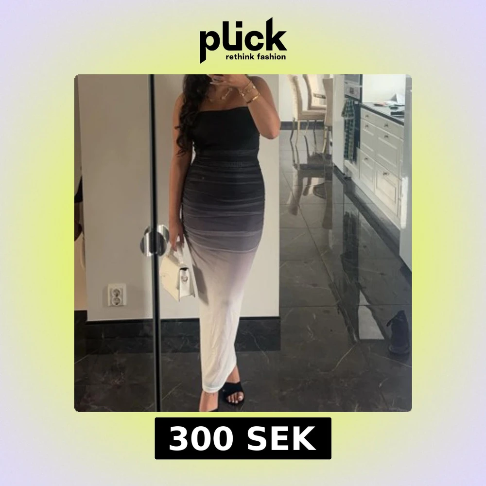 Snygg axelbandslös klänning i svart och vit med en gradvis övergång mellan färgerna. Klänningen har en tight passform som framhäver figuren och är perfekt för en elegant kväll. Den långa längden ger en sofistikerad look.