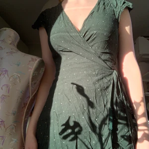 En grön och vit prickig omlottklänningen som är köpt på secondhand. Jag har använt den en gång och den har tyvärr blivit för kort på mig.
