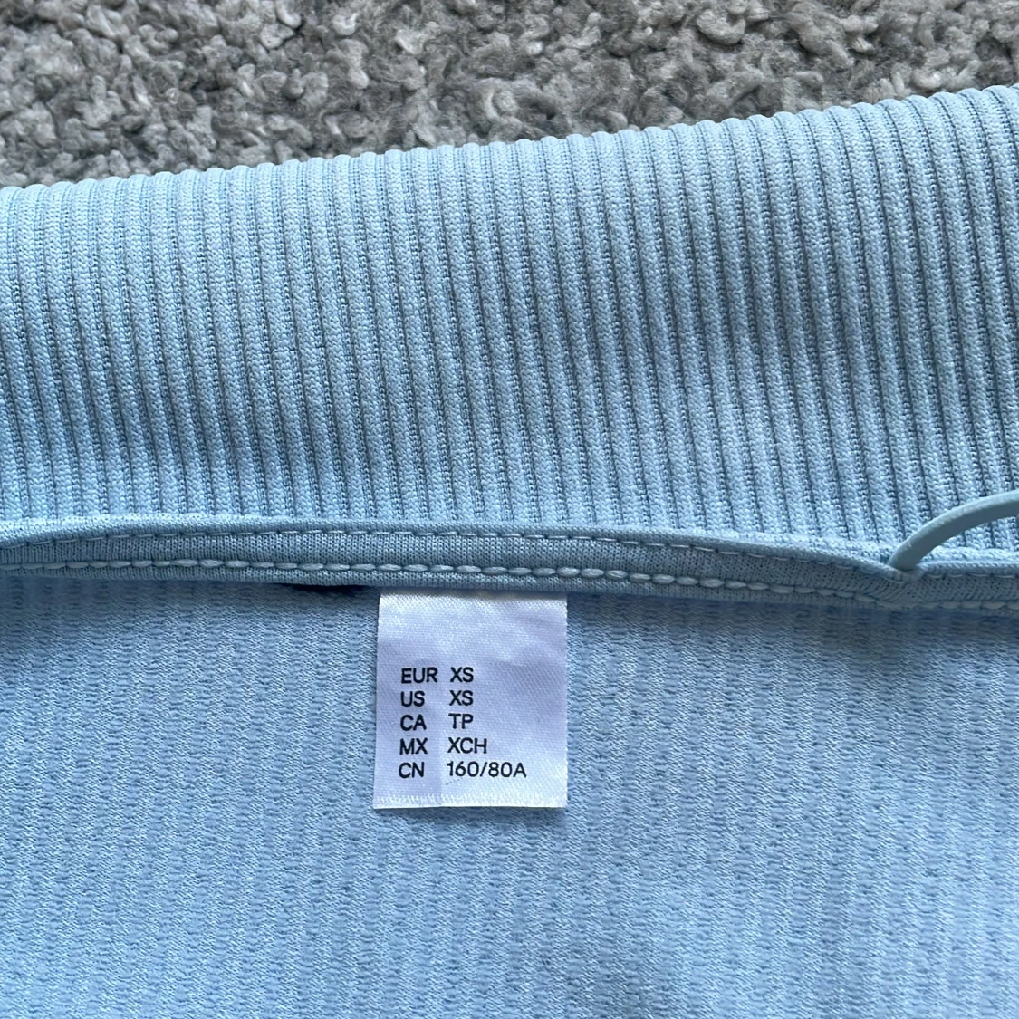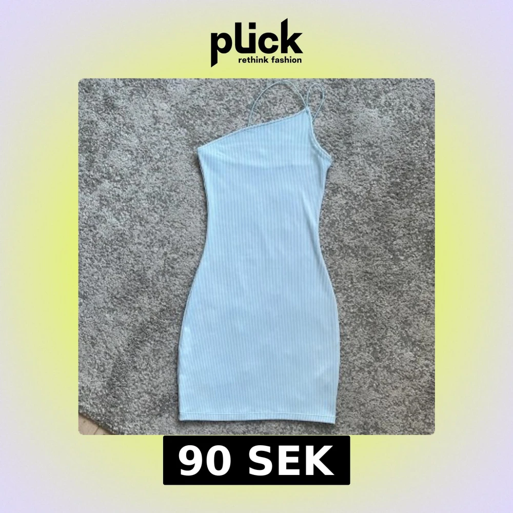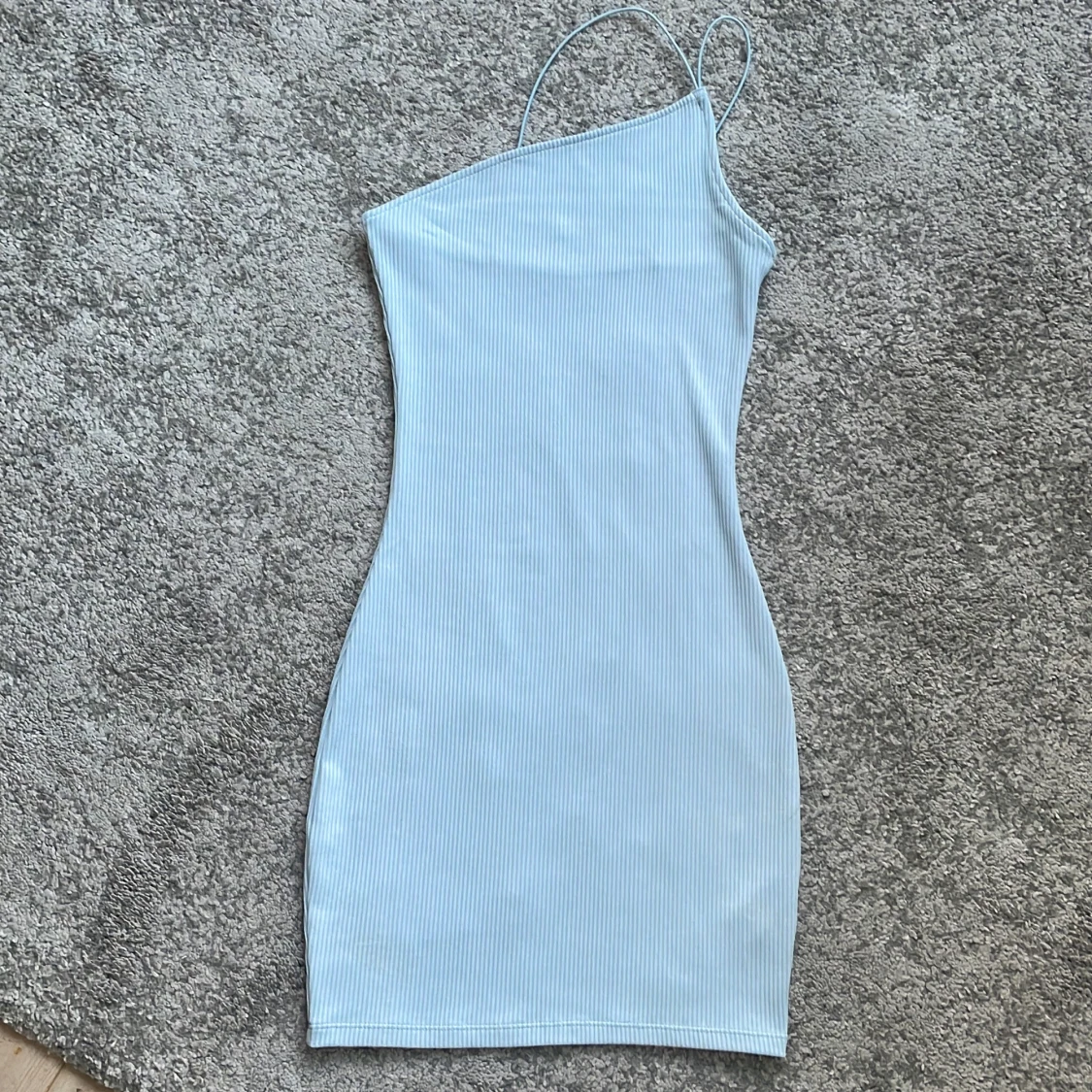 Supersöt ljusblå ribbad kortklänning med smala axelband och asymmetrisk one shoulder-design. Tight passform som framhäver figuren och perfekt för varma dagar. Enkel men trendig stil som är lätt att matcha med sneakers eller sandaler.