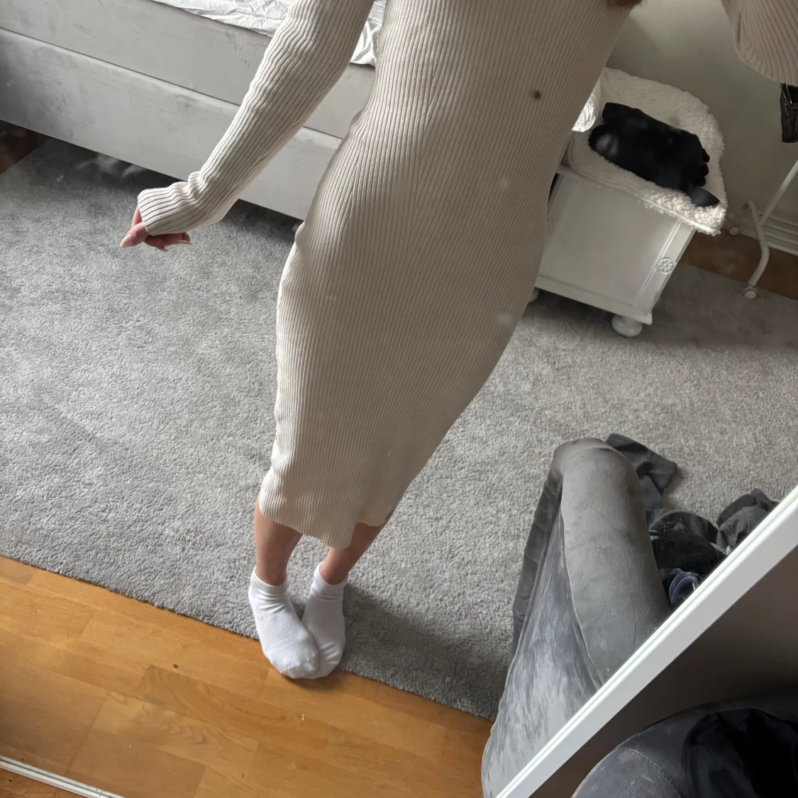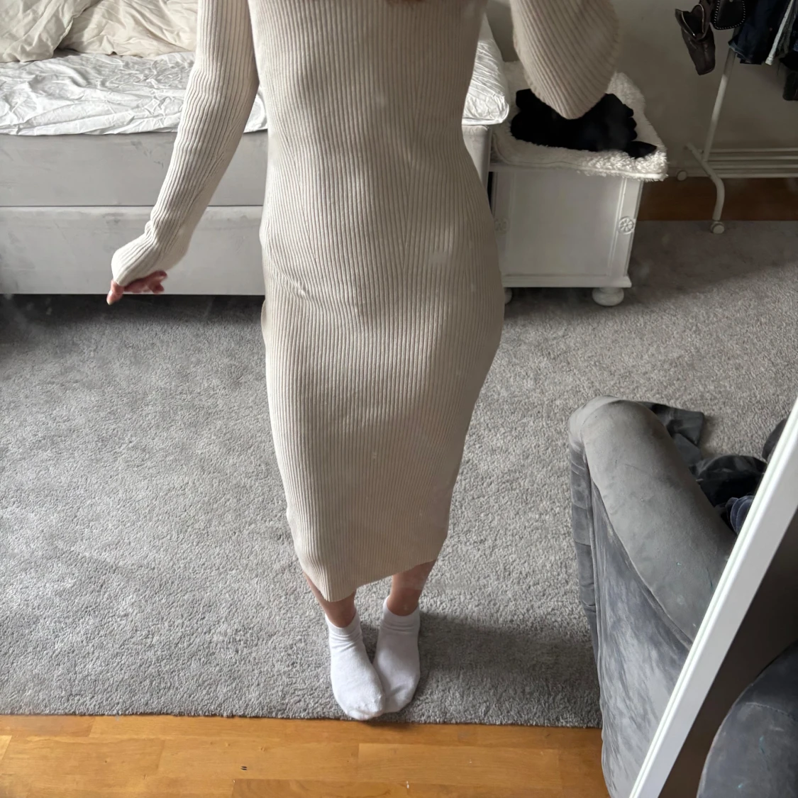 Säljer en beige ribbad långklänning med lång ärm och rund i halsen. Klänningen har en tight passform och är tillverkad i ett stretchigt material som sitter snyggt på kroppen. Perfekt för dig som gillar en enkel men stilren look.💕