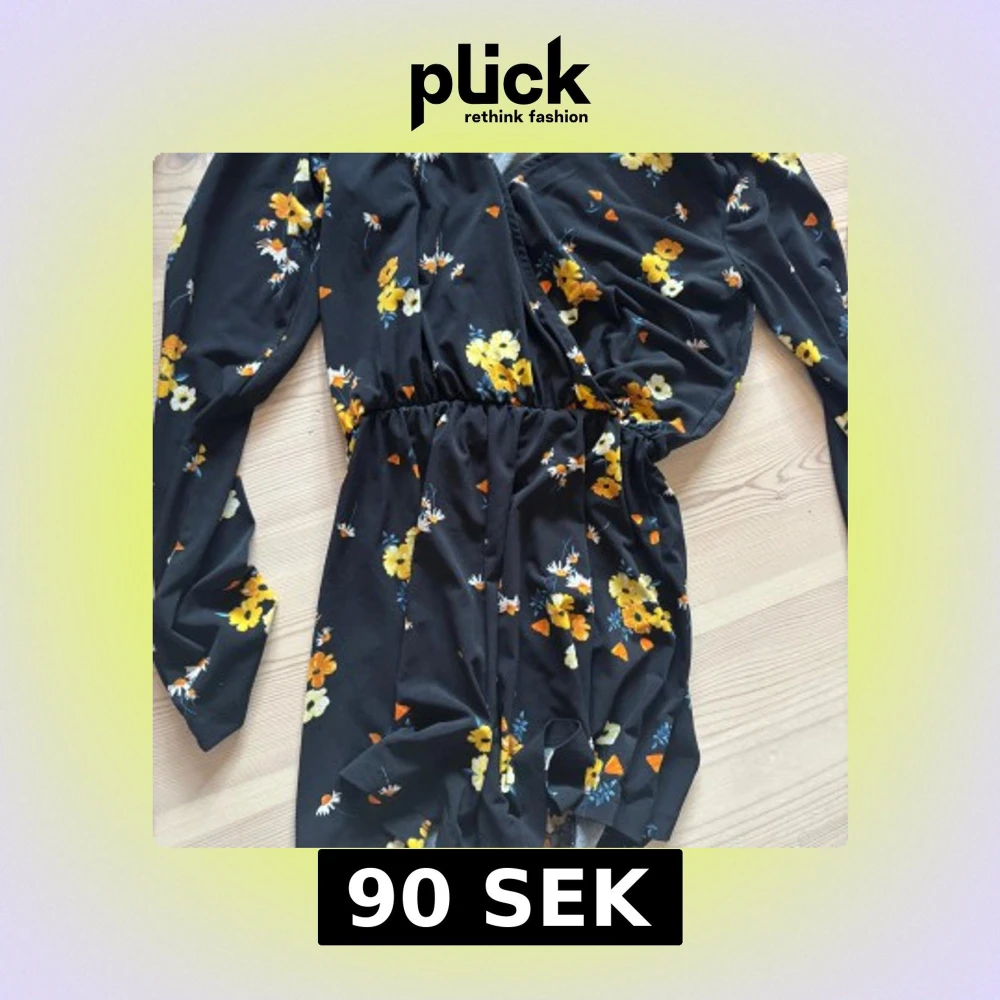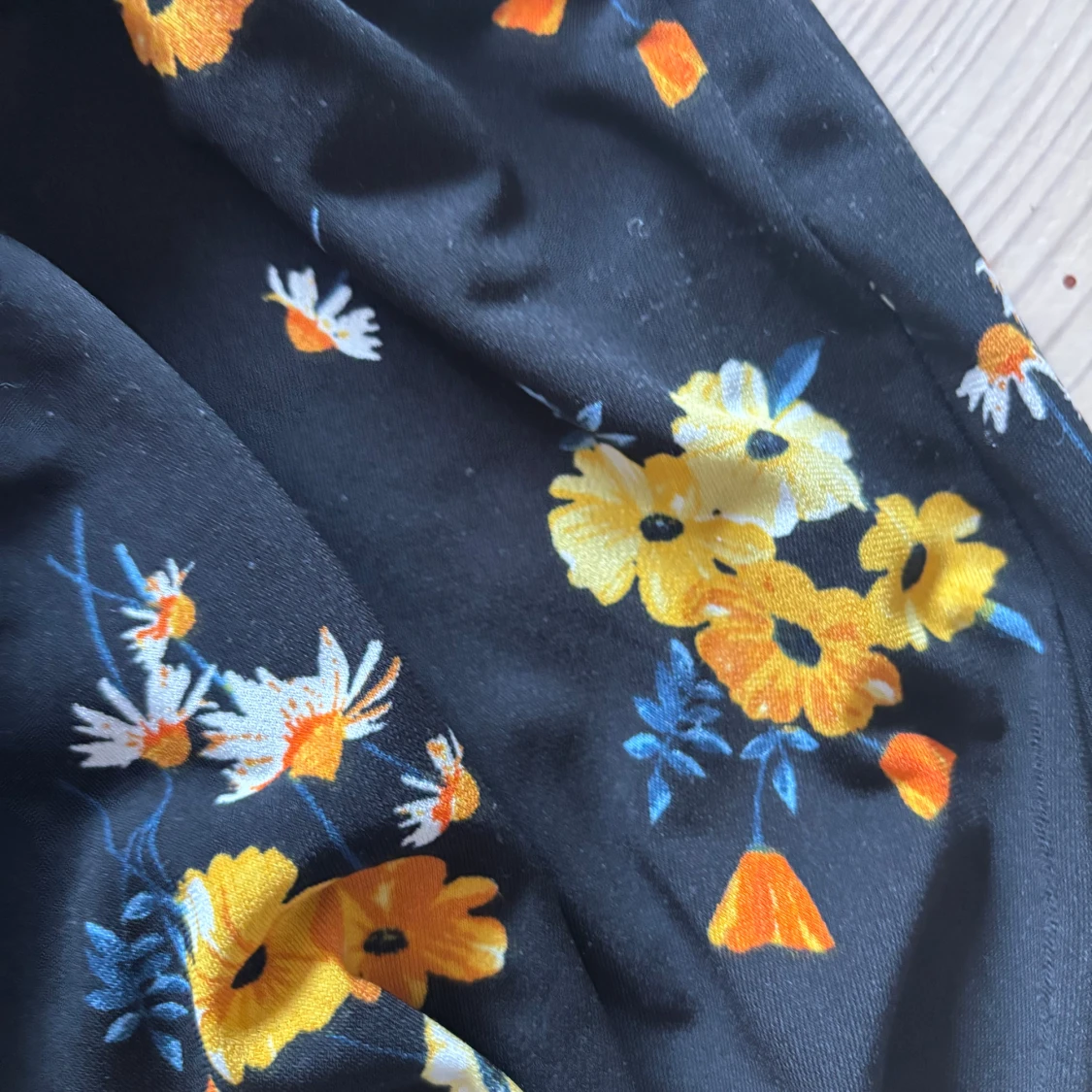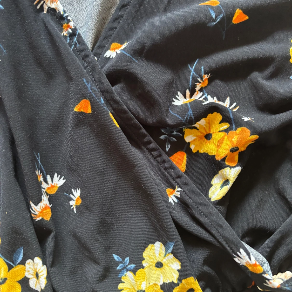Supersöt svart kort byxdress med gula och vita blommor, omlottmodell och långa ärmar. Byxdressen har resår i midjan och är perfekt för dig som gillar en feminin och trendig stil. Materialet känns lätt och flowy.