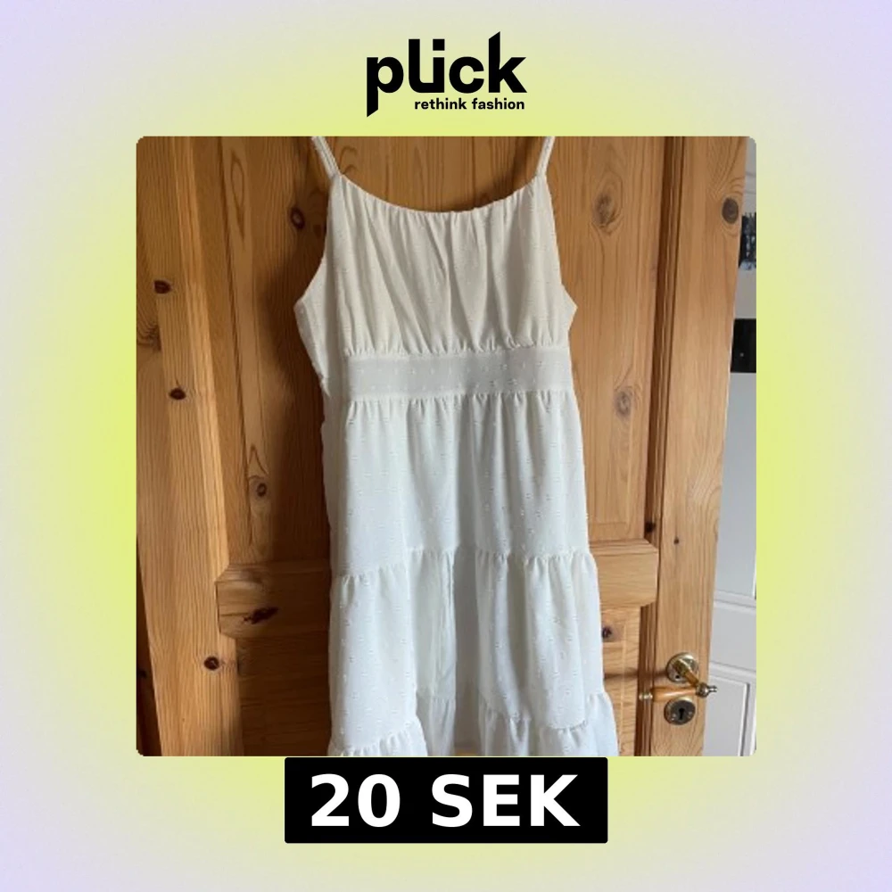 Säljer en vit, ärmlös klänning med smala axelband och volangdetaljer. Klänningen har ett lätt prickigt mönster och smock i ryggen för skön passform. Perfekt för varma dagar och har en luftig, flowy känsla. Passar dig som gillar enkel och fräsch stil.
