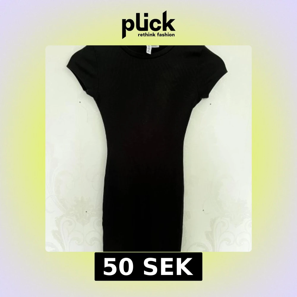 En svart, tight ribbad kortklänning från Divided. Klänningen har korta ärmar och rund halsringning. Enkel och stilren modell som sitter figurnära.