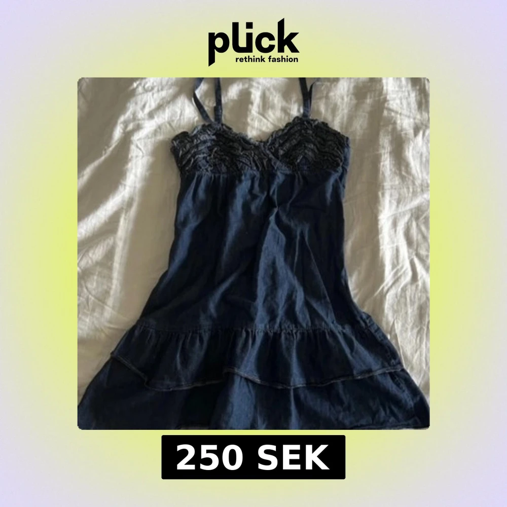 Charmig mörkblå klänning med spetsdetaljer på bysten och volang i nederkant. Man kan ha klänningen antigen axelbandslös eller med axelband. Perfekt för sommarens varma dagar.