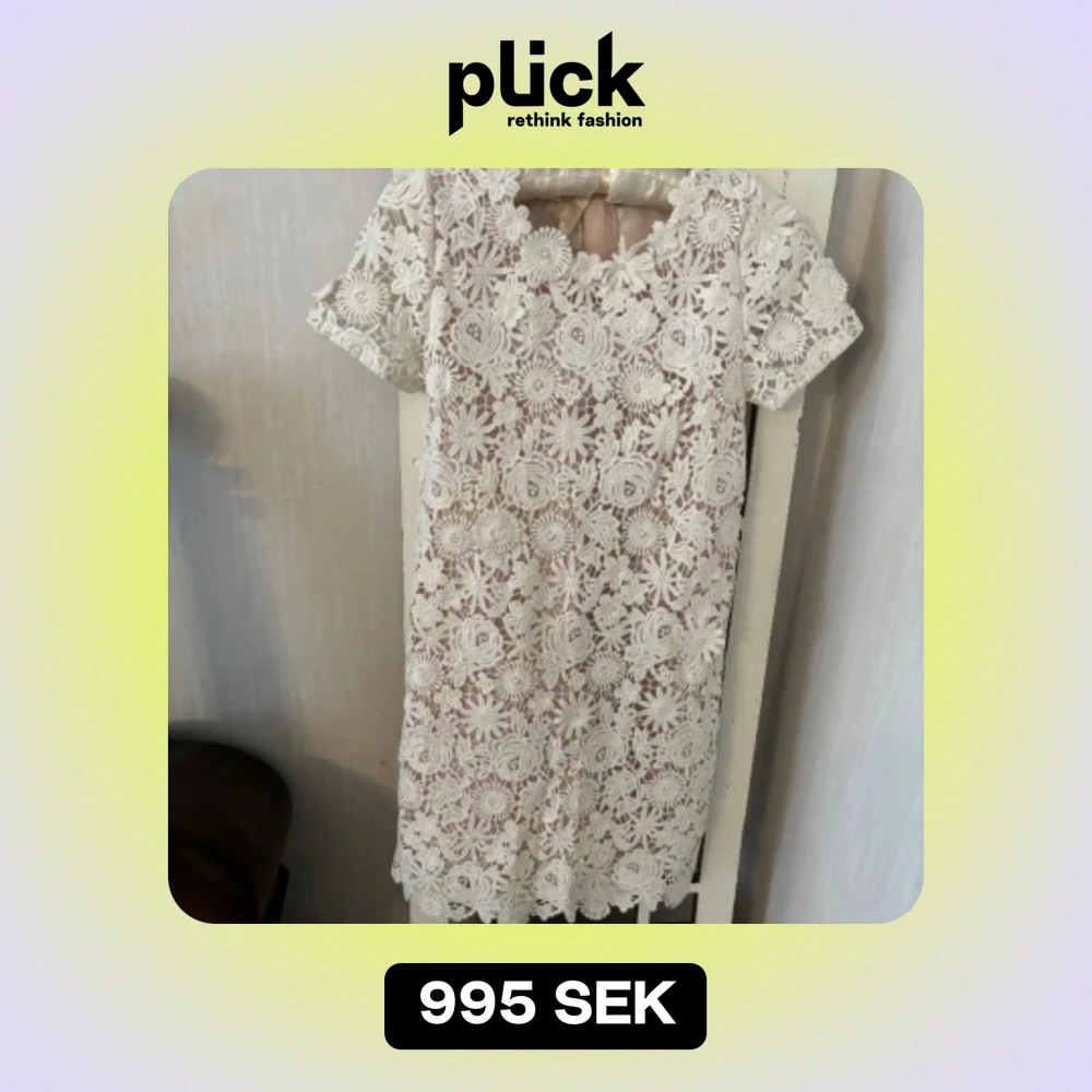 Vit spetsklänning med volangärmar - Superfin vit kortklänning i spets med blommigt mönster och volangiga axelband. Klänningen har en luftig och loose passform, perfekt för varma dagar. Söt och romantisk stil med v-ringning och detaljerade kanter. Ingen synlig dragkedja eller knappar.