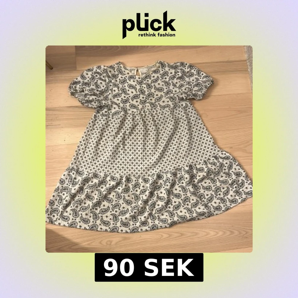 Charmig klänning från Zara med ett svart paisleymönster på vit bakgrund. Klänningen har korta puffärmar och en volangdetalj vid fållen. Perfekt för en avslappnad och stilfull look.