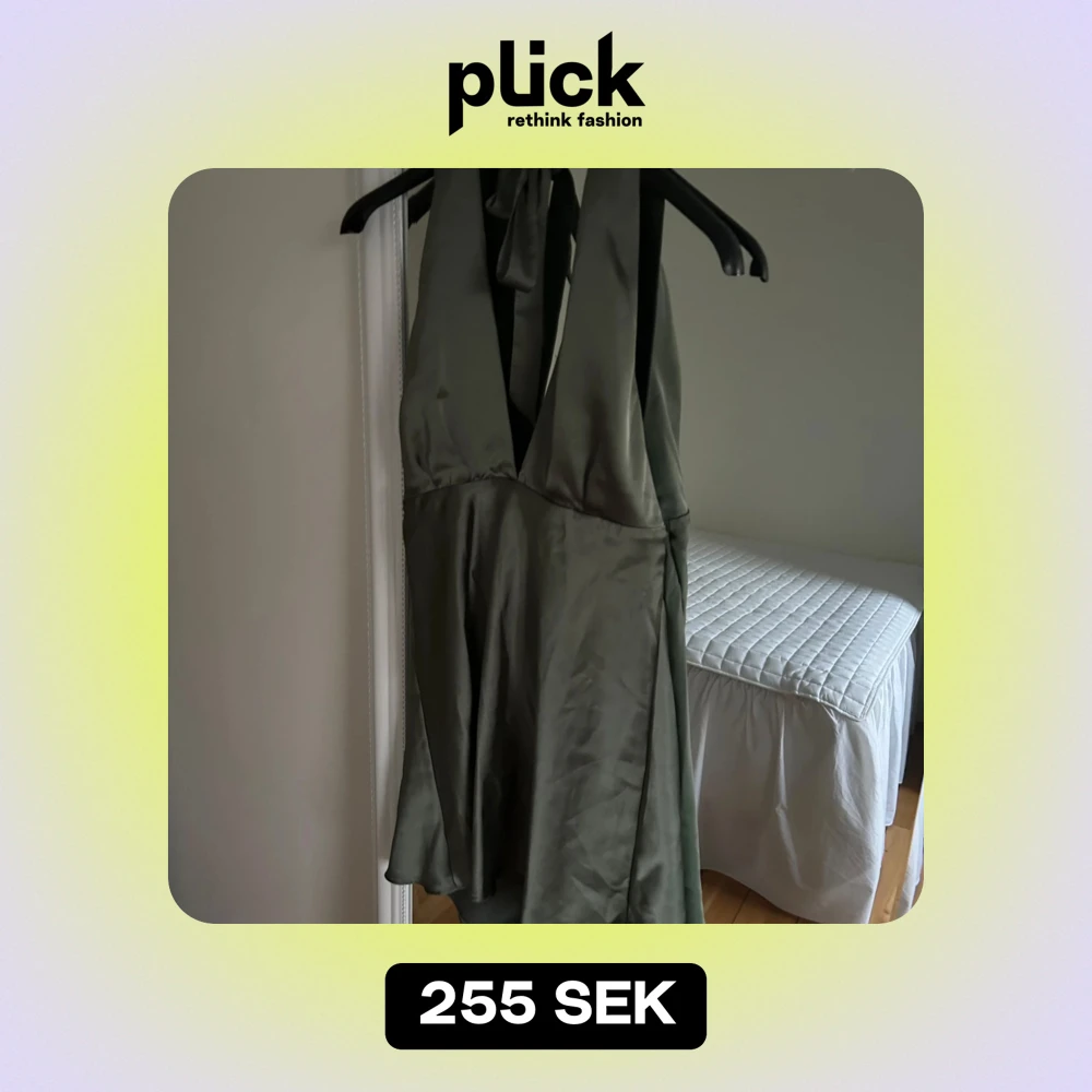 Snygg grön halterneckklänning från Zara i storlek L. Passar M. Klänningen har en djup v-ringning och är tillverkad i ett glansigt satinmaterial. Perfekt för fest! Den har en knytning i nacken och en dragkedja i sidan. Mindre slitningar föekommer, se sista bilden❣️🫶🏻