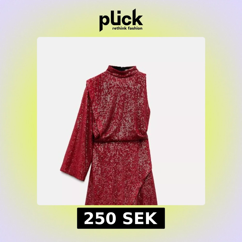 Säljer en röd glittrig kortklänning med hög krage och en lång ärm. Klänningen har en unik asymmetrisk design och en lätt omlott-effekt framtill. Perfekt för dig som vill sticka ut med en trendig look.