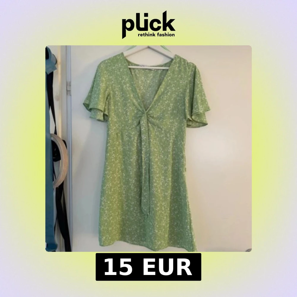 Säljer en söt grön klänning med blommigt mönster och korta ärmar. Klänningen har en v-ringad design med knytning framtill och volangdetaljer vid ärmarna.