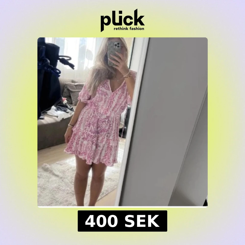 Superfin kortklänning i vitt och rosa med blommigt mönster. Klänningen har v-ringning med knyt, volangkant nertill och resår i midjan. Lätt och luftig med korta ärmar, perfekt för varma dagar.