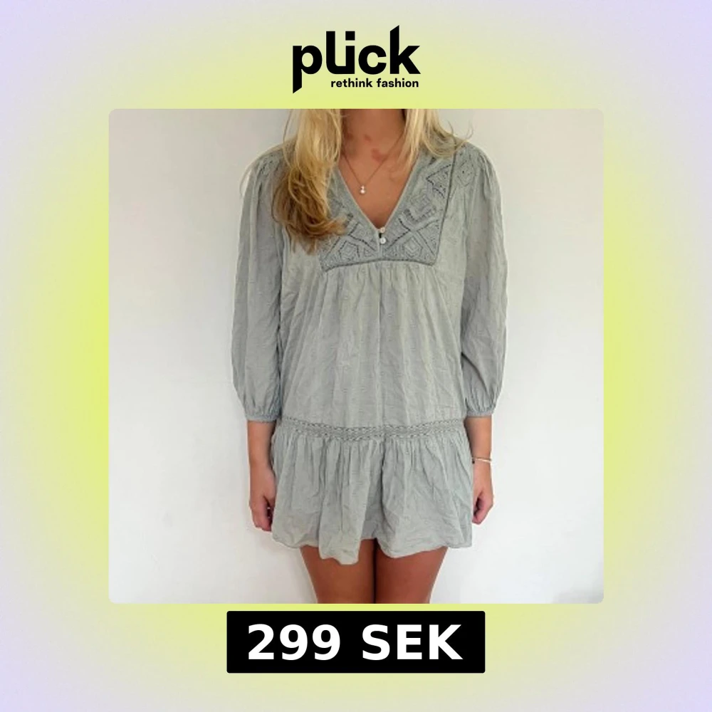 Superfin ljusgrå kort klänning med v-ringning och broderade detaljer upptill. Klänningen har trekvartsärmar, små prickar i tyget och ett volangformat avslut nedtill.