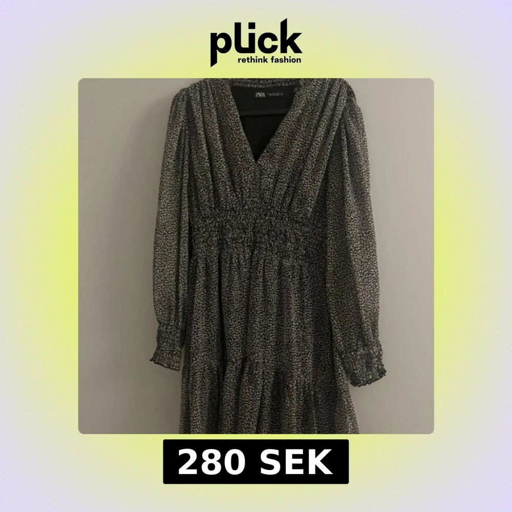Snygg svart och vit klänning från Zara med v-ringning och långa ärmar. Klänningen har ett diskret mönster och smockdetaljer i midjan för en smickrande passform. Perfekt för både vardag och festliga tillfällen.