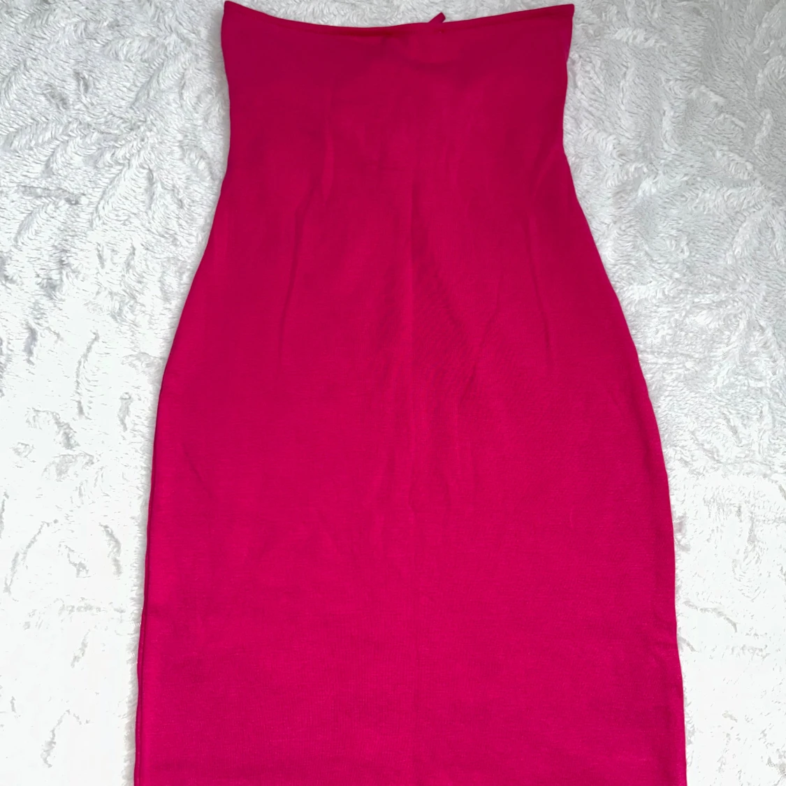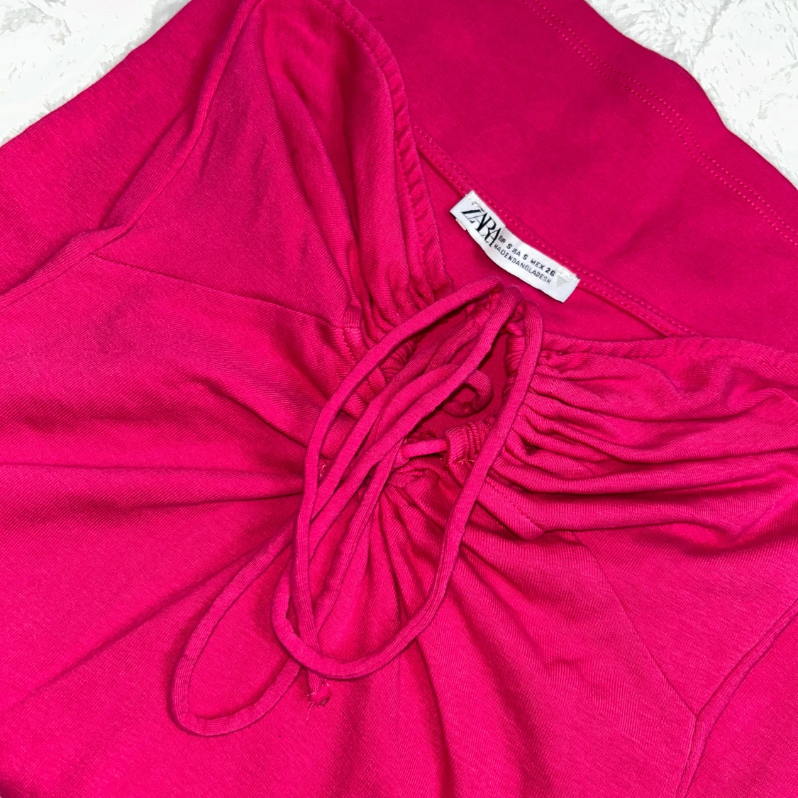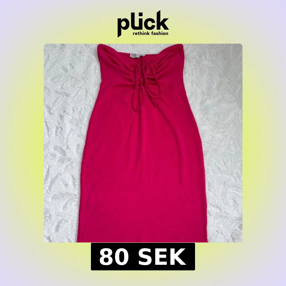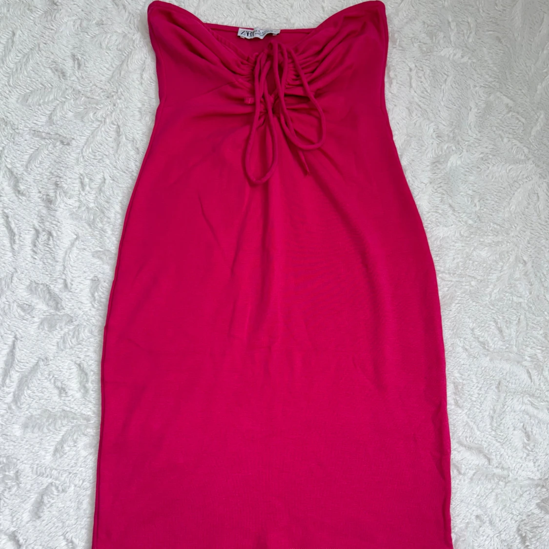 Supersnygg rosa klänning från Zara med snörning framtill och axelbandslös design. Klänningen är figurnära och har en kort längd. Skriv om flera bilder önskas 🥰
