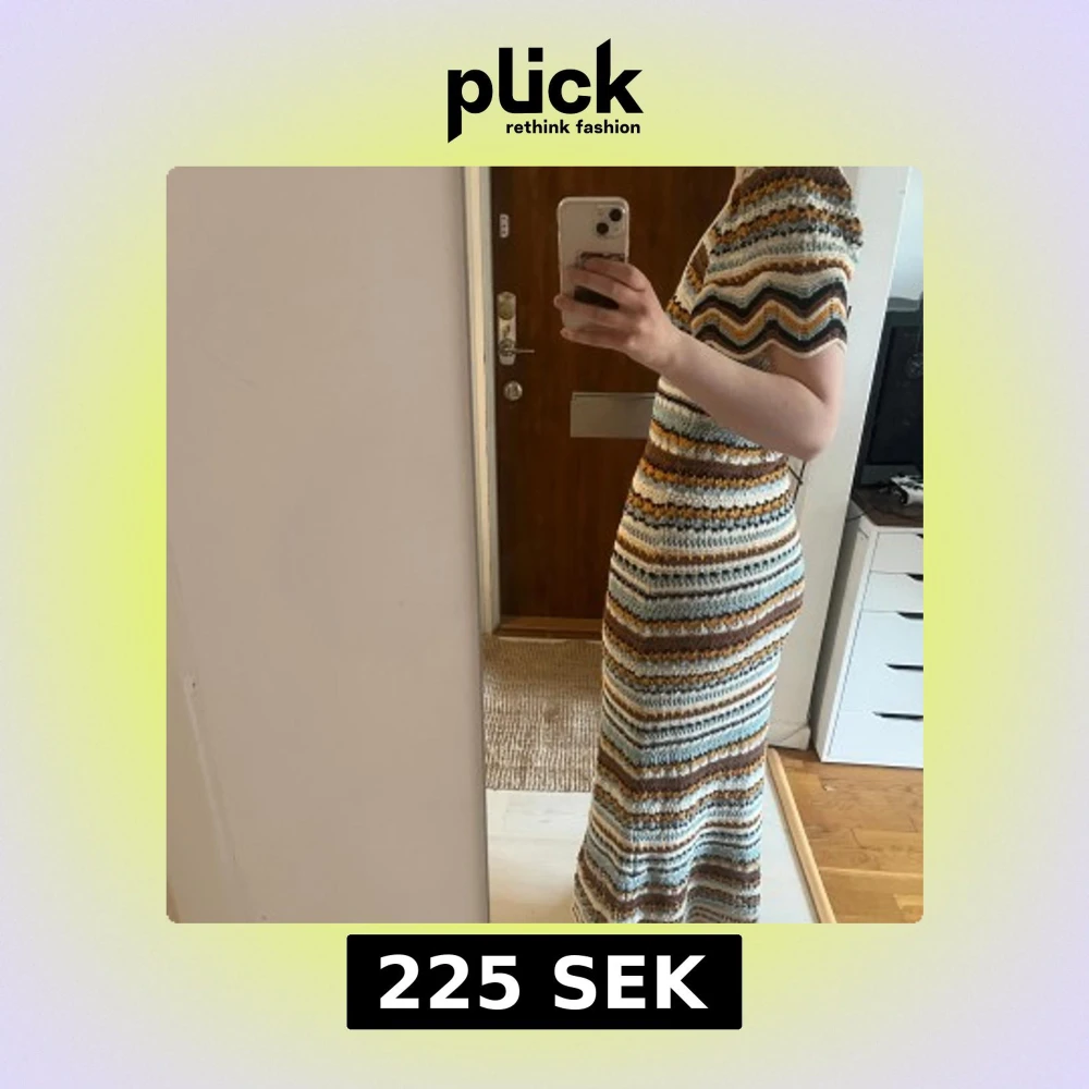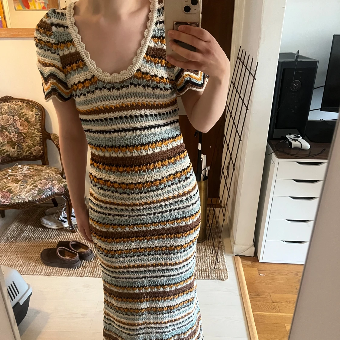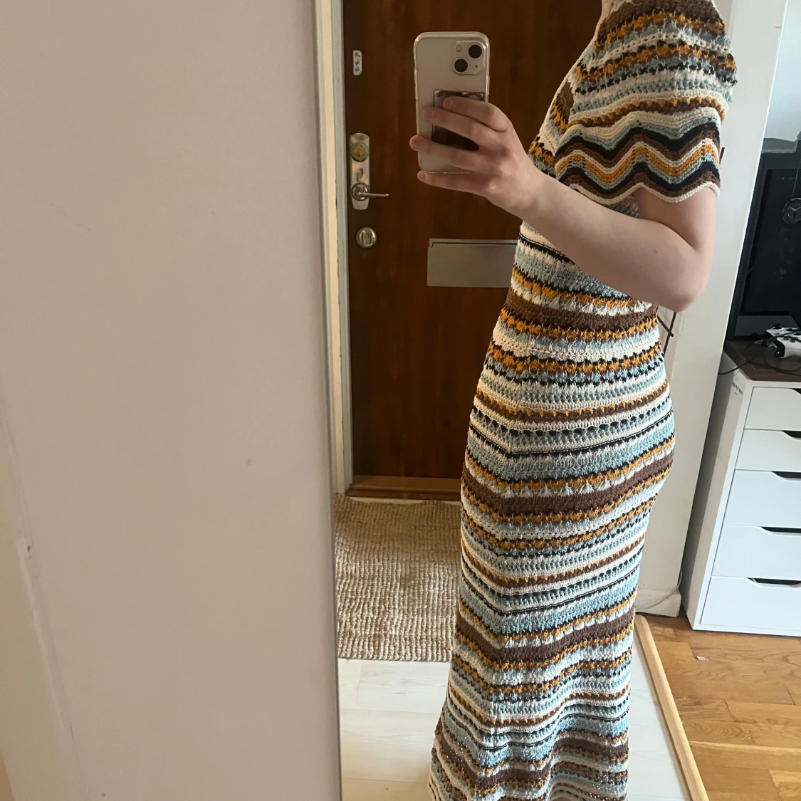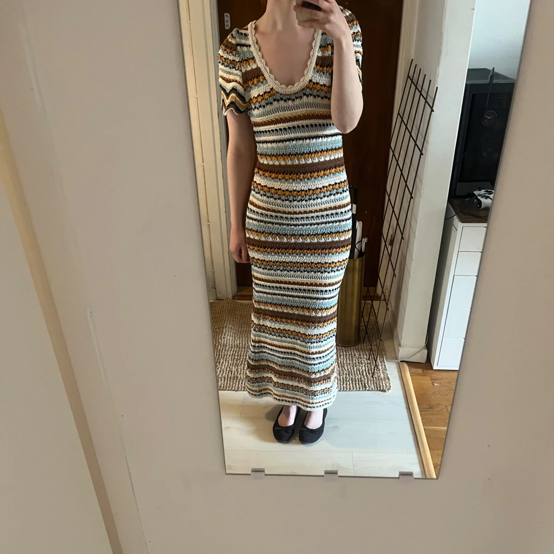 Säljer en stickad långklänning med kort ärm och v-ringning. Klänningen har ett färgglatt randigt mönster i beige, vit, brun, blå och gul. Den är figurnära och har virkade detaljer vid halsringningen.