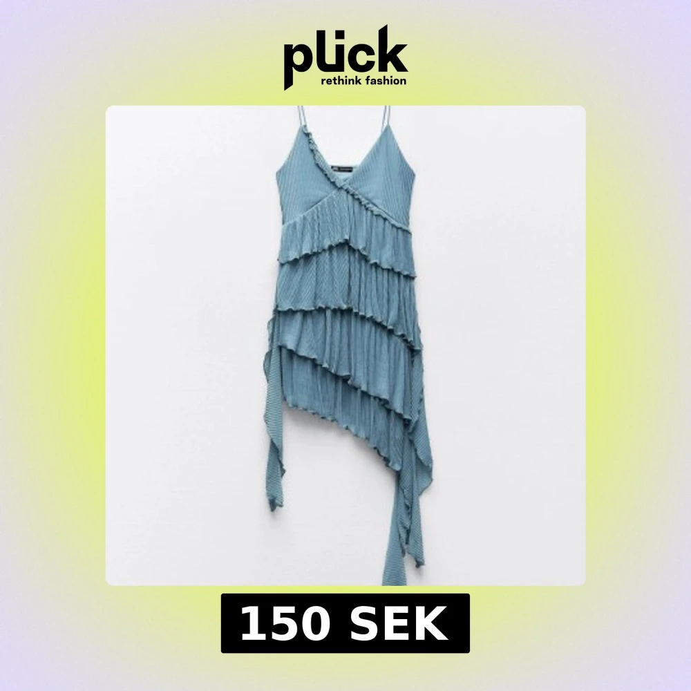 Snygg blå klänning med smala axelband och asymmetrisk design. Klänningen har flera lager av volanger som ger en unik look. Perfekt för en somrig dag eller en speciell kväll. Aldrig använd. Prislapp kvar
