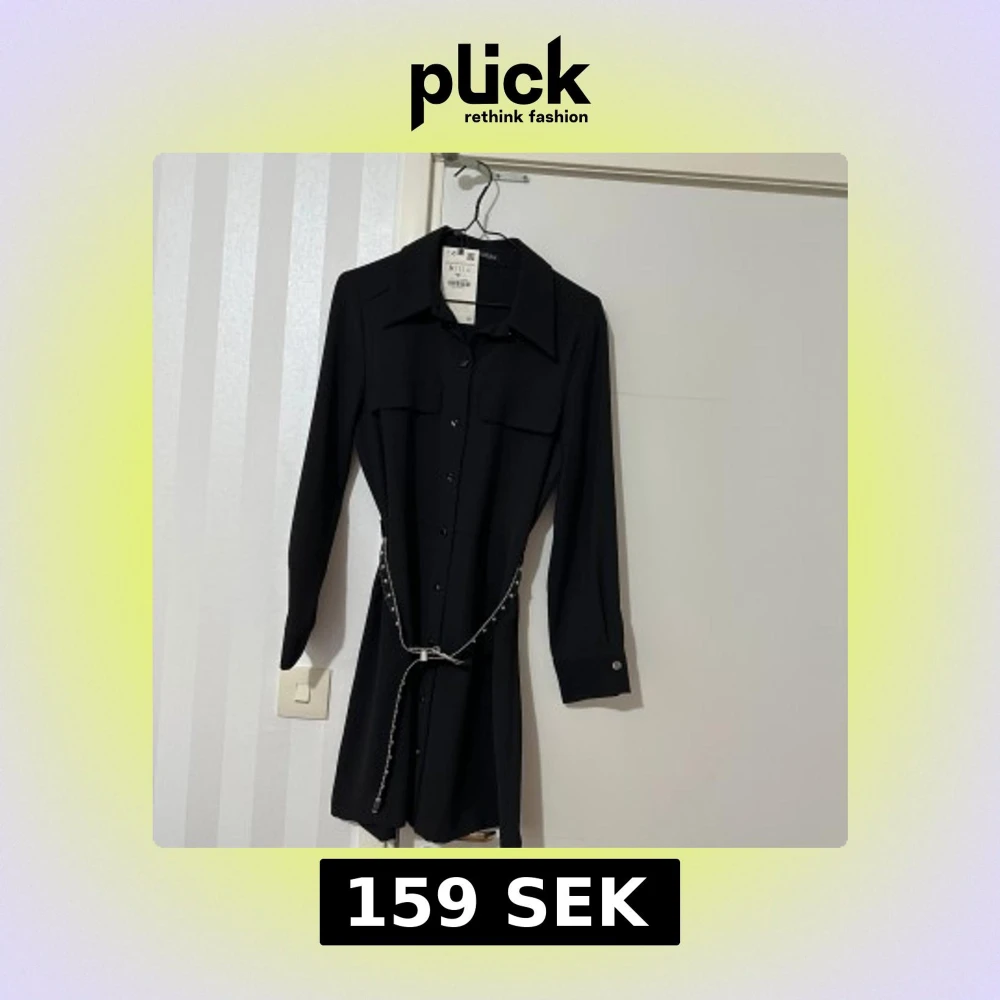 Elegant svart klänning med långa ärmar och knappar framtill. Den har en stilren krage och två bröstfickor. Klänningen kommer med ett glittrigt bälte som ger en extra touch av glamour.
