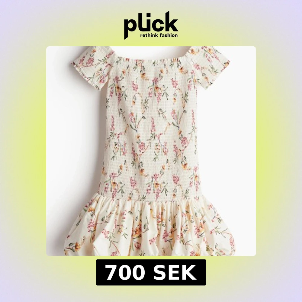 Supersöt kortklänning från HM. Offshoulder med korta ärmar, smockad överdel och volangig kjol.