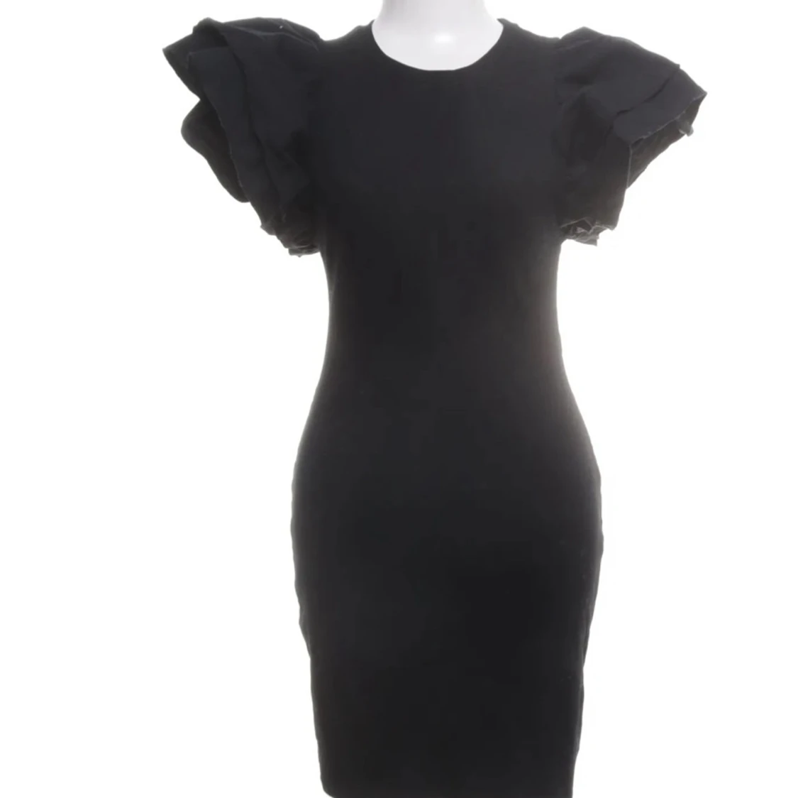 Supersnygg svart kort klänning med markerad midja och stora volangärmar. Köpt 2022 men endast använd 1 gång så den är som ny.