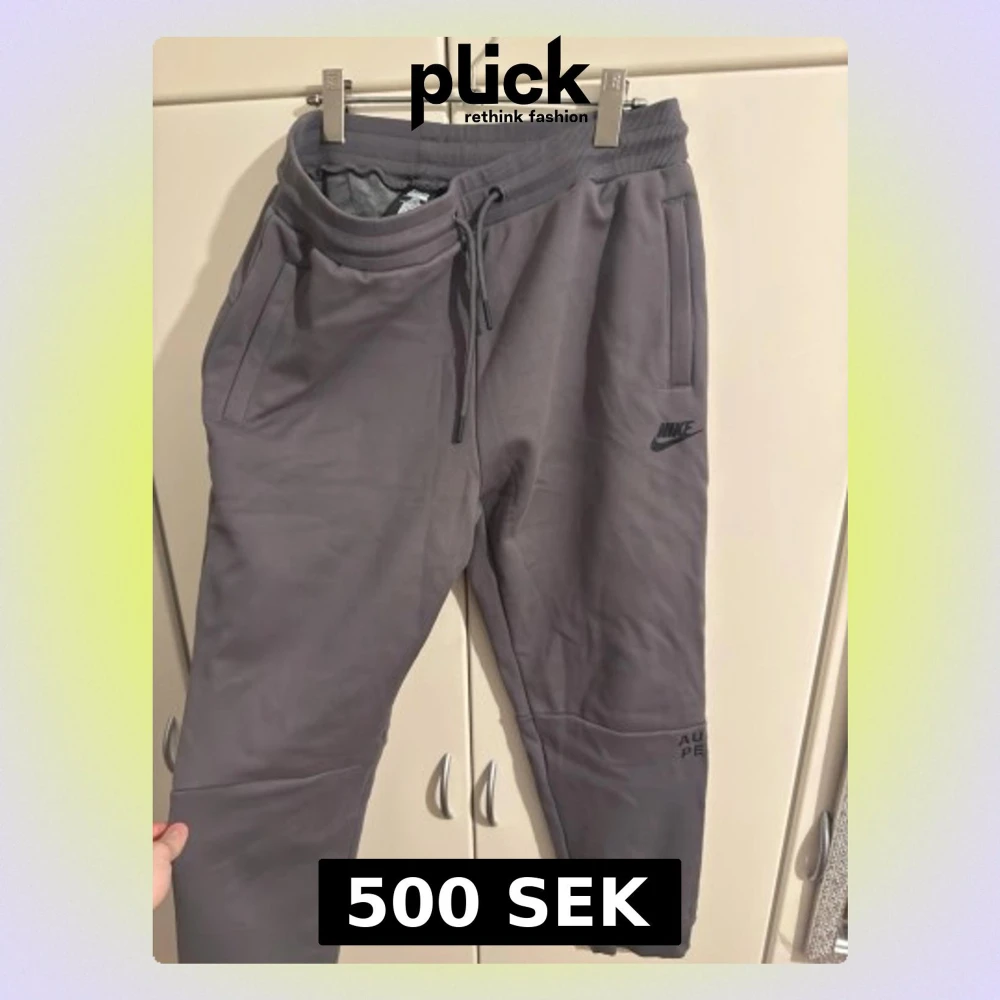 Säljer ett par gråa mjukisbyxo med ribbade muddar. Byxorna har två sidofickor och Nike-logga på vänster ben. Tillverkade i mjukt material som passar perfekt för chill dagar. Snygg, enkel design med tryckdetaljer på benen. OBS. TAGG SÄGER XXL MEN PASSAR M-L.