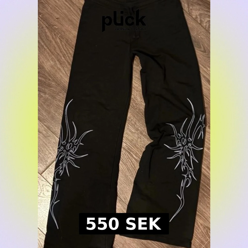 Supersnygga svarta Lågmidjade byxor m. Vida ben, i använt men fint skick! 💕🌸 (Trycket har mycket små sprickor, men knappt märkbara, om man ej letar)