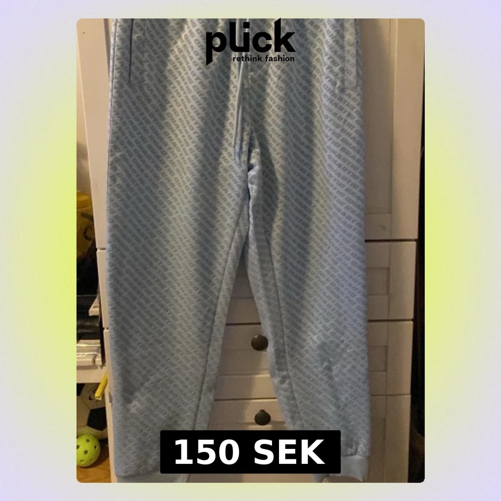 Säljer ett par ljusblåa mj sopbyxor från FSBN med dragsko i midjan och droppat logomönster över hela tyset fact. Perfekta för chill dagar och har en relaxed fit. Materialet känns mjukt och varna sopbyxorna är riktigt sköna att ha på sig.
