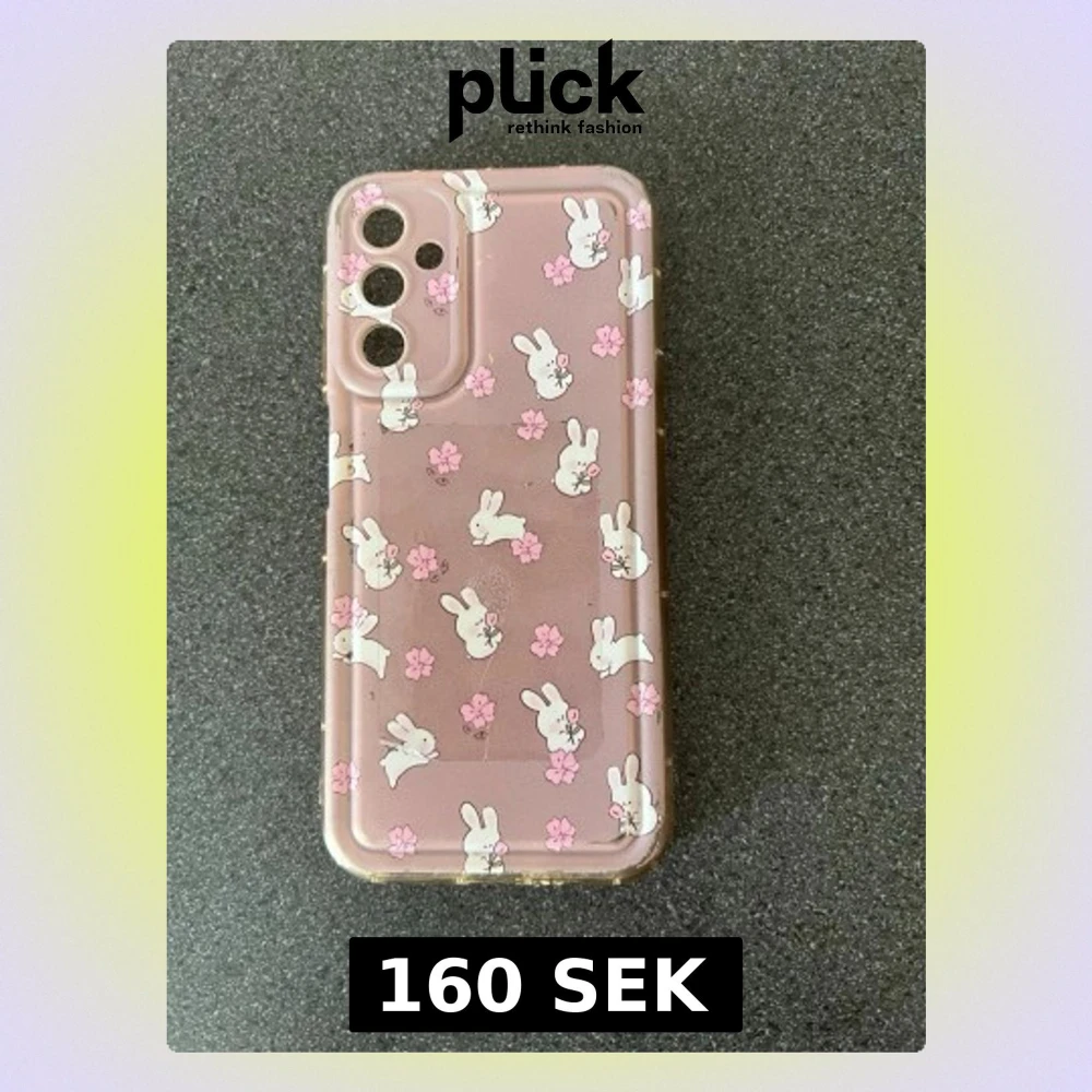 Två genomskinliga mobilskal med gulliga vita kaniner och blommor. Ett skal har rosa blommor och det andra har vita blommor. Skalens kanter är transparenta och de har öppningar för kamera och knappar. Perfekt för dig som vill ha ett lekfullt och unikt mobilskal.
