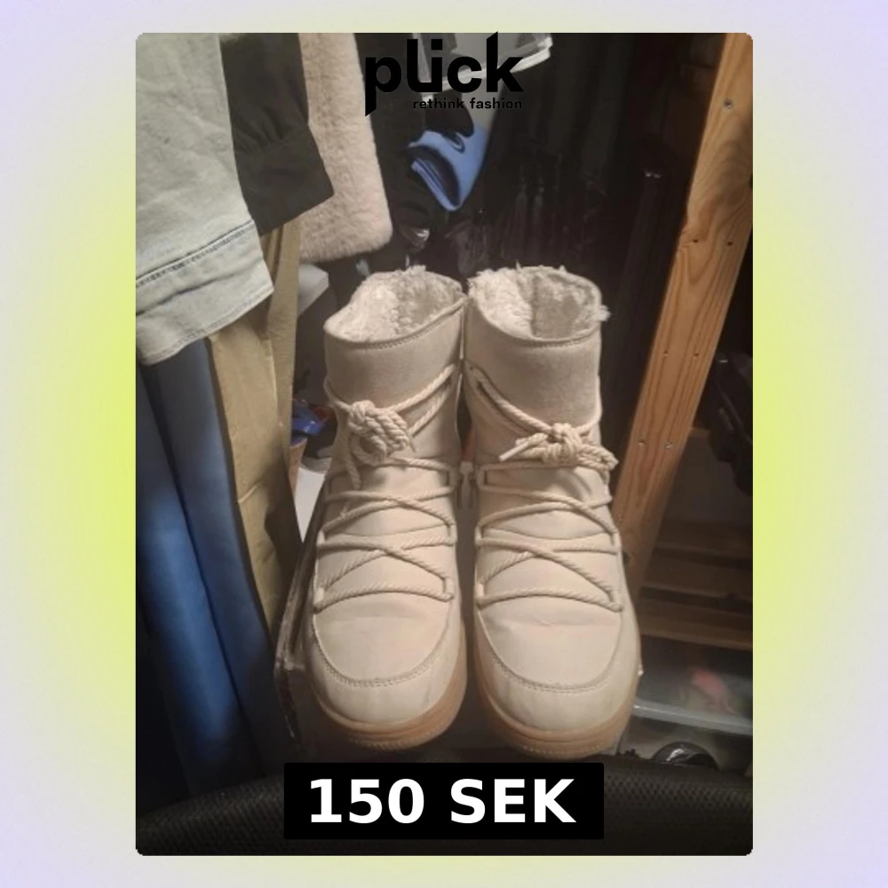 Säljer ett par beige moon boots med grov snörning och fluffigt foder. Skorna har en hög modell och rund tå, samt en ljusbrun sula. Perfekta för kalla dagar när du vill hålla värmen och ändå se stilren ut.