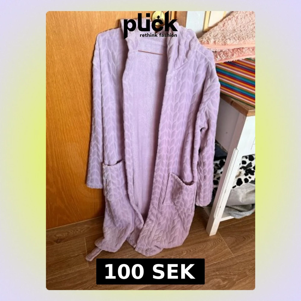 Mysig ljuslila morgonrock i mjukt fleece-material med huva och knytskärp i midjan. Har två stora fickor framtill och ett diskret mönster i tyget. Perfekt för att chilla hemma och hålla sig varm. Storleken är onesize, mej passar den bra och jag har storlek 48