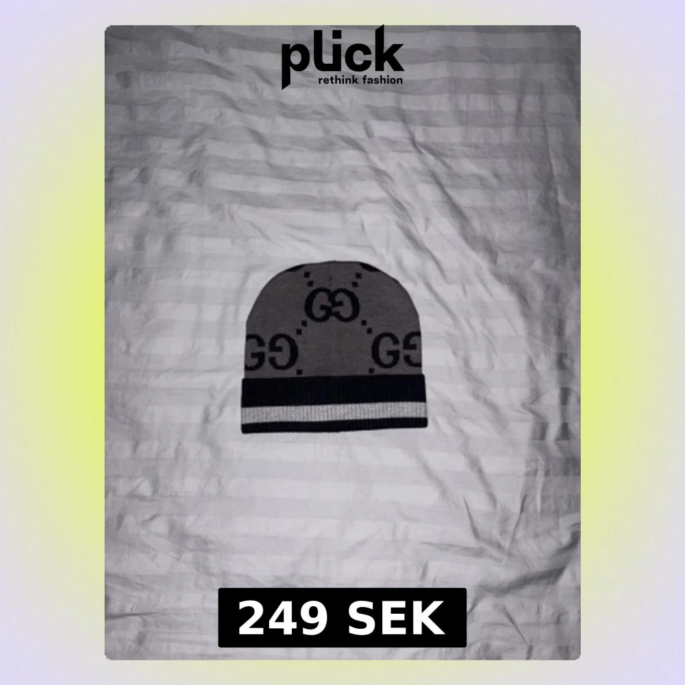 En grå och svart gg-mönstrad mössa från gucci. Hatten har ett stilrent och snyggt logomönster, och är designad med randig kant. Perfekt för dig som vill ha något trendigt och klassiskt. Mössan är diskret men ändå lyxig.