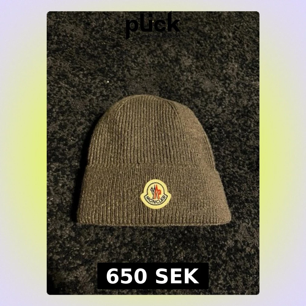 Säljer en grå ribbstickad mössa från Moncler med uppvikt kant och det klassiska Moncler-logotypen framtill. Mössan är tillverkad i mjukt material och har en enkel, stilren design som passar perfekt till höst och vinter.