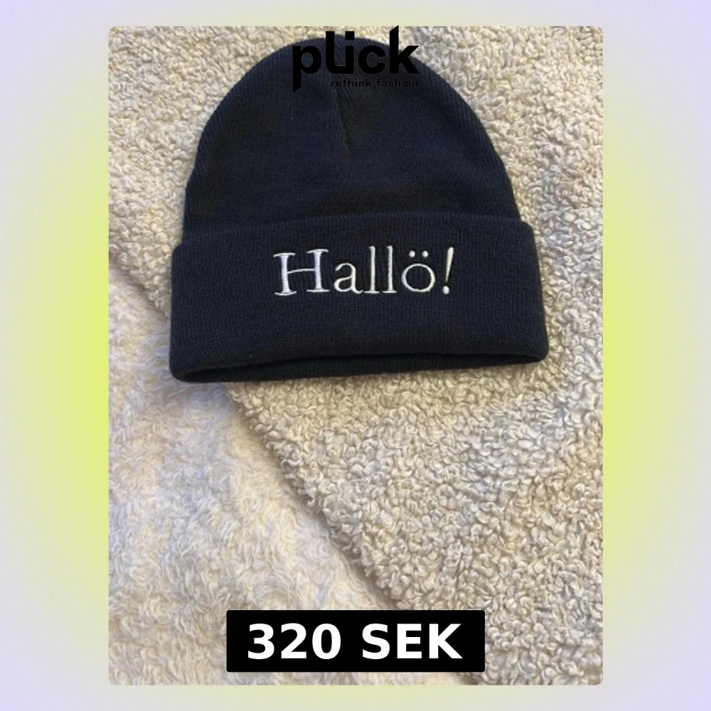 Snygg svart mössa i ribbstickad bomull med uppvikt kant och vit broderad text 'Hallö!' framtill. Perfekt accessoar för att hålla värmen och addera lite attityd till din outfit.