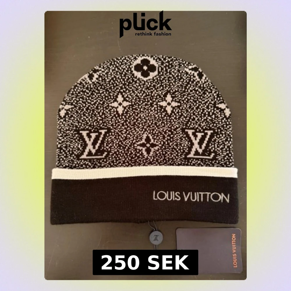 Snygg svart mössa med klassiskt monogrammönster i vitt och kontrasterande vit kant. Perfekt accessoar för dig som vill ha en exklusiv och trendig look. Helt ny, oanvänd.
