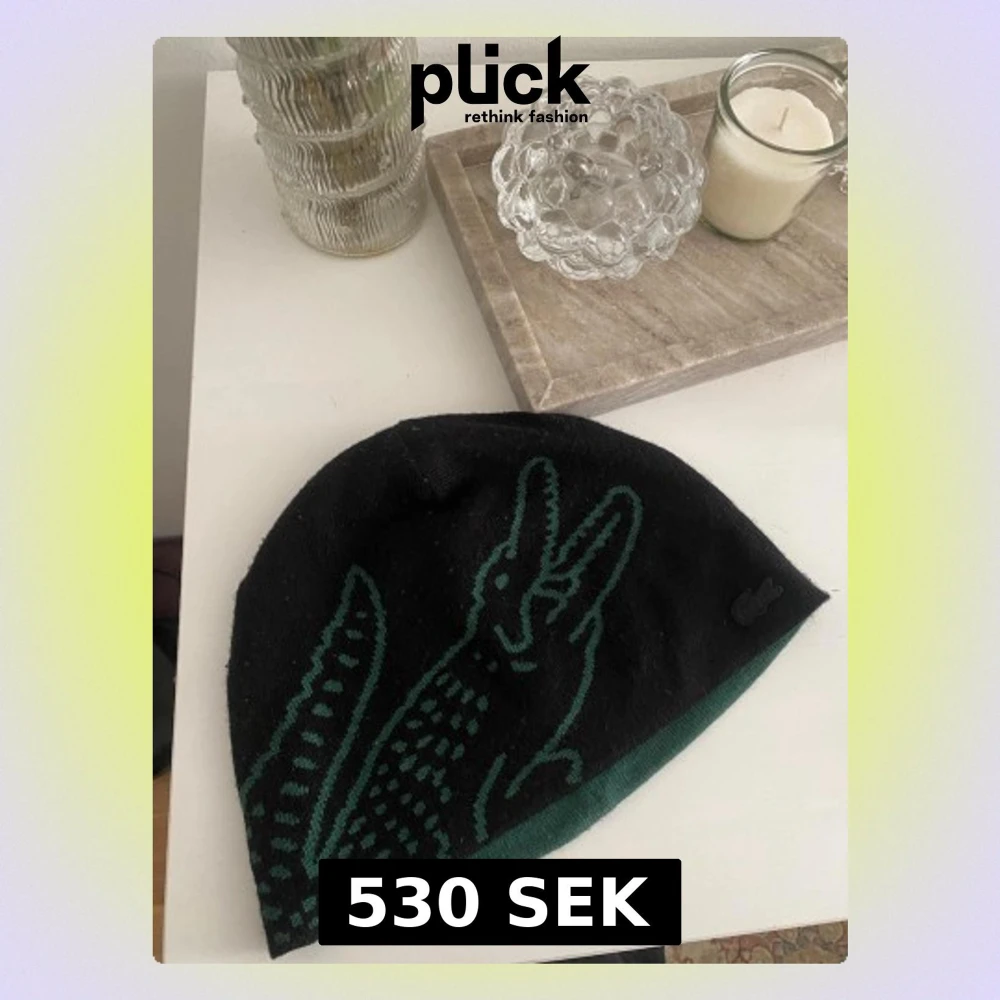 Säljer en vändbar mössa från Lacoste med ikonisk krokodil på båda sidor. Ena sidan är svart med grön krokodil och den andra är grön med svart krokodil. Mössan är stickad i mjukt material och har en avslappnad passform. Perfekt för dig som vill ha två stilar i en.